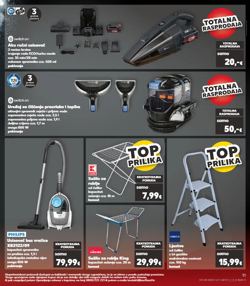 aku ručni usisavač 2 razine brzine trajanje rada eco/turbo mode cca. 35 min/20 min volumen spremnika cca. 500 ml pakiranje totalna rasprodaja samo 20,- € usisavač bez vrećice xb2122/09 kapacitet spremnika za prašinu cca. 1,3 l teleskopska metalna cijev snaga 850 w pakiranje uređaj za čišćenje presvlaka i tepiha uklonjivi spremnik svježe i prljave vode zapremnina svježe vode cca. 2,5 l zapremnina prljave vode cca. 1,9 l duljina crijeva cca. 1,7 m snaga 800 w pakiranje kratkotrajna ponuda totalna rasprodaja samo samo 79,99 € 50,- € sušilo za rublje od čelika kapacitet sušenja cca. 18 m komad kratkotrajna ponuda samo 7,99 € sušilo za rublje king kapacitet sušenja cca. 20 m komad kratkotrajna ponuda samo 29,99 € ljestve od čelika s tri gazišta maksimalna nosivost cca. 150 kg komad kratkotrajna ponuda samo 15,99 € totalna totalna totalna r a spr od aj a rasprodaja totalna totalna totalna r a spr od aj a rasprodaja top top top top prilik a prilika top top top top prilik a prilika neprehrambeni proizvodi dostupni su količinski i vremenski strogo ograničeno, te je za istima u pravilu potražnja povećana. stoga upućujemo naše cijenjene kupce da je sve detalje oko istih moguće dobiti na našem info-pultu izravno, ili pak unaprijed putem upravljanja odnosa s kupcima, na broj 0800/223 223 ili putem e.maila kontakt@kaufland.hr s11-hr-kw47-lft-aktf1_2_4_r-1030-11 11