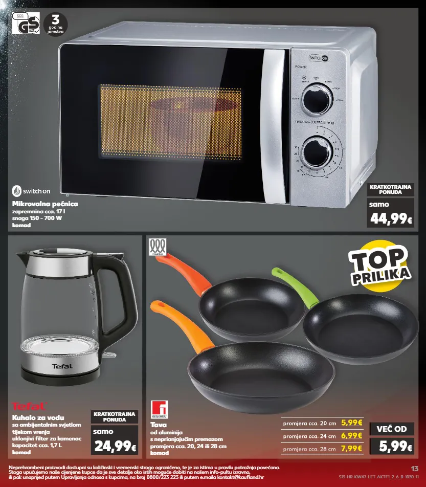 promjera cca. 28 cm kuhalo za vodu sa ambijentalnim svjetlom tijekom vrenja uklonjivi filter za kamenac kapacitet cca. 1,7 l komad mikrovalna pećnica zapremnina cca. 17 l snaga 150 - 700 w komad kratkotrajna ponuda kratkotrajna ponuda samo samo 24,99 € 44,99 € tava od aluminija s neprianjajućim premazom promjera cca. 20, 24 ili 28 cm komad već od 5,99 € top top top top prilik a prilika promjera cca. 20 cm 5,99€ promjera cca. 24 cm 6,99€ 7,99€ promjera cca. 20 cm 5,99€ 5,99€ promjera cca. 20 cm promjera cca. 20 cm 5,99€ promjera cca. 24 cm promjera cca. 24 cm 6,99€ promjera cca. 24 cm promjera cca. 24 cm 6,99€ promjera cca. 28 cm 7,99€ promjera cca. 28 cm 7,99€ promjera cca. 28 cm 7,99€ neprehrambeni proizvodi dostupni su količinski i vremenski strogo ograničeno, te je za istima u pravilu potražnja povećana. stoga upućujemo naše cijenjene kupce da je sve detalje oko istih moguće dobiti na našem info-pultu izravno, ili pak unaprijed putem upravljanja odnosa s kupcima, na broj 0800/223 223 ili putem e.maila kontakt@kaufland.hr s13-hr-kw47-lft-aktf1_2_6_r-1030-11 13