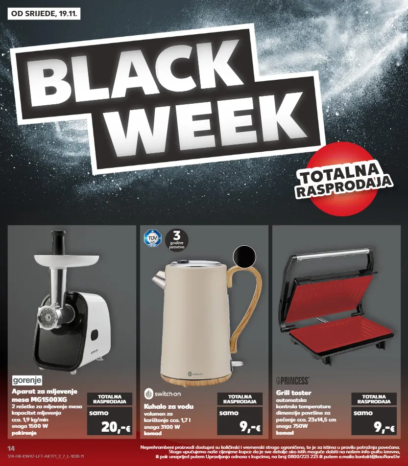 od srijede, 19.11. bl a c a c a k week totalna totalna r a spr od aj a rasprodaja kuhalo za vodu volumen za korištenje cca. 1,7 l snaga 3100 w komad totalna rasprodaja samo 9,- € aparat za mljevenje mesa mg1500xg 2 rešetke za mljevenje mesa kapacitet mljevenja cca. 1,9 kg/min snaga 1500 w pakiranje grill toster automatska kontrola temperature dimenzije površine za pečenje cca. 23x14,5 cm snaga 750w komad totalna rasprodaja totalna rasprodaja samo samo 20,- € 9,- € neprehrambeni proizvodi dostupni su količinski i vremenski strogo ograničeno, te je za istima u pravilu potražnja povećana. stoga upućujemo naše cijenjene kupce da je sve detalje oko istih moguće dobiti na našem info-pultu izravno, ili pak unaprijed putem upravljanja odnosa s kupcima, na broj 0800/223 223 ili putem e.maila kontakt@kaufland.hr s14-hr-kw47-lft-aktf1_2_7_l-1030-11 14