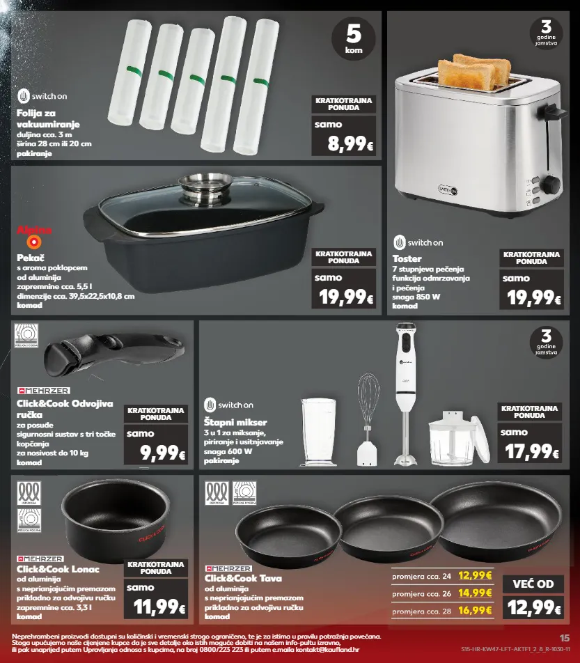 promjera cca. 28 štapni mikser 3 u 1 za miksanje, piriranje i usitnjavanje snaga 600 w pakiranje kratkotrajna ponuda samo 17,99 € pekač s aroma poklopcem od aluminija zapremnine cca. 5,5 l dimenzije cca. 39,5x22,5x10,8 cm komad kratkotrajna ponuda samo 19,99 € click&cook odvojiva ručka za posuđe sigurnosni sustav s tri točke kopčanja za nosivost do 10 kg komad click&cook lonac od aluminija s neprianjajućim premazom prikladno za odvojivu ručku zapremnine cca. 3,3 l komad kratkotrajna ponuda kratkotrajna ponuda samo samo 9,99 € 11,99 € click&cook tava od aluminija s neprianjajućim premazom prikladno za odvojivu ručku komad folija za vakuumiranje duljina cca. 3 m širina 28 cm ili 20 cm pakiranje kratkotrajna ponuda samo 8,99 € toster 7 stupnjeva pečenja funkcija odmrzavanja i pečenja snaga 850 w komad kratkotrajna ponuda samo 19,99 € promjera cca. 24 12,99€ promjera cca. 26 14,99€ 16,99€ promjera cca. 24 12,99€ 12,99€ promjera cca. 24 12,99€ promjera cca. 26 promjera cca. 26 14,99€ promjera cca. 26 promjera cca. 26 14,99€ promjera cca. 28 16,99€ promjera cca. 28 16,99€ promjera cca. 28 16,99€ već od 12,99 € 5 kom neprehrambeni proizvodi dostupni su količinski i vremenski strogo ograničeno, te je za istima u pravilu potražnja povećana. stoga upućujemo naše cijenjene kupce da je sve detalje oko istih moguće dobiti na našem info-pultu izravno, ili pak unaprijed putem upravljanja odnosa s kupcima, na broj 0800/223 223 ili putem e.maila kontakt@kaufland.hr s15-hr-kw47-lft-aktf1_2_8_r-1030-11 15