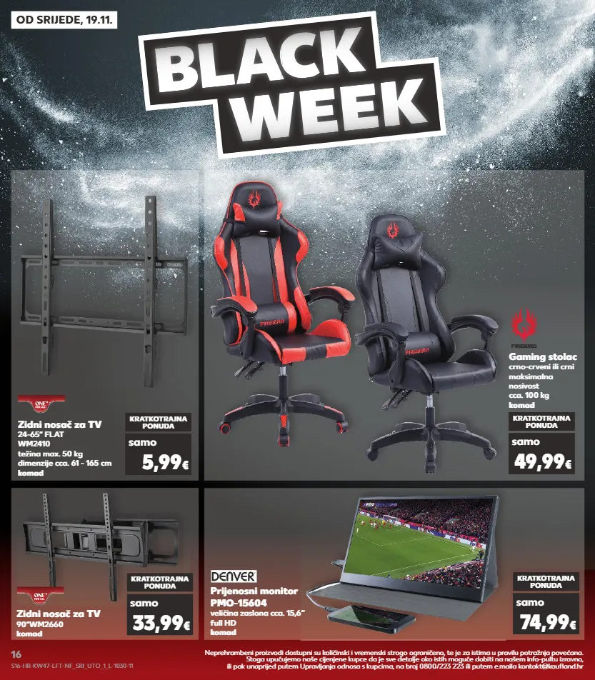 od srijede, 19.11. bl a c a c a k week prijenosni monitor pmo-15604 veličina zaslona cca. 15,6‘‘ full hd komad zidni nosač za tv 90“wm2660 komad kratkotrajna ponuda samo 33,99 € kratkotrajna ponuda samo 74,99 € zidni nosač za tv 24-65“ flat wm2410 težina max. 50 kg dimenzije cca. 61 - 165 cm komad kratkotrajna ponuda samo 5,99 € gaming stolac crno-crveni ili crni maksimalna nosivost cca. 100 kg komad firebird kratkotrajna ponuda samo 49,99 € neprehrambeni proizvodi dostupni su količinski i vremenski strogo ograničeno, te je za istima u pravilu potražnja povećana. stoga upućujemo naše cijenjene kupce da je sve detalje oko istih moguće dobiti na našem info-pultu izravno, ili pak unaprijed putem upravljanja odnosa s kupcima, na broj 0800/223 223 ili putem e.maila kontakt@kaufland.hr s16-hr-kw47-lft-nf_sri_uto_1_l-1030-11 16
