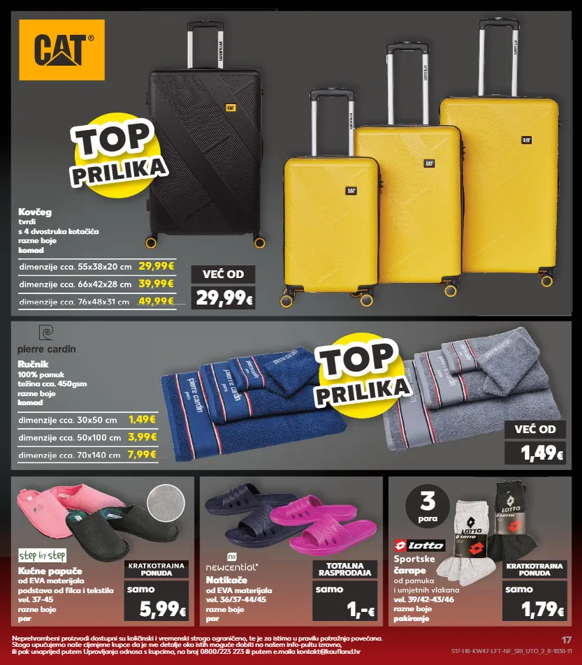 dimenzije cca. 76x48x31 cm dimenzije cca. 70x140 cm već od 1,49 € već od 29,99 € sportske čarape od pamuka i umjetnih vlakana vel. 39/42-43/46 razne boje pakiranje sportske od pamuka i umjetnih vlakana natikače od eva materijala vel. 36/37-44/45 razne boje par totalna rasprodaja samo 1,- € ručnik 100% pamuk težina cca. 450gsm razne boje komad kratkotrajna ponuda samo 5,99 € kućne papuče od eva materijala podstava od filca i tekstila vel. 37-45 razne boje par kovčeg tvrdi s 4 dvostruka kotačića razne boje komad dimenzije cca. 55x38x20 cm 29,99€ dimenzije cca. 66x42x28 cm 39,99€ 49,99€ dimenzije cca. 55x38x20 cm dimenzije cca. 55x38x20 cm 29,99€ dimenzije cca. 55x38x20 cm 29,99€ dimenzije cca. 66x42x28 cm 39,99€ dimenzije cca. 66x42x28 cm 39,99€ dimenzije cca. 76x48x31 cm 49,99€ dimenzije cca. 76x48x31 cm 49,99€ dimenzije cca. 76x48x31 cm 49,99€ dimenzije cca. 30x50 cm 1,49€ dimenzije cca. 50x100 cm 3,99€ 7,99€ dimenzije cca. 30x50 cm dimenzije cca. 30x50 cm 1,49€ dimenzije cca. 30x50 cm 1,49€ dimenzije cca. 50x100 cm dimenzije cca. 50x100 cm 3,99€ dimenzije cca. 50x100 cm 3,99€ dimenzije cca. 70x140 cm dimenzije cca. 70x140 cm 7,99€ dimenzije cca. 70x140 cm dimenzije cca. 70x140 cm 7,99€ dimenzije cca. 70x140 cm dimenzije cca. 70x140 cm 7,99€ top top top prilik a prilika top top top prilik a prilika kratkotrajna kratkotrajna ponuda samo 1,79 € 3 para neprehrambeni proizvodi dostupni su količinski i vremenski strogo ograničeno, te je za istima u pravilu potražnja povećana. stoga upućujemo naše cijenjene kupce da je sve detalje oko istih moguće dobiti na našem info-pultu izravno, ili pak unaprijed putem upravljanja odnosa s kupcima, na broj 0800/223 223 ili putem e.maila kontakt@kaufland.hr s17-hr-kw47-lft-nf_sri_uto_2_r-1030-11 17