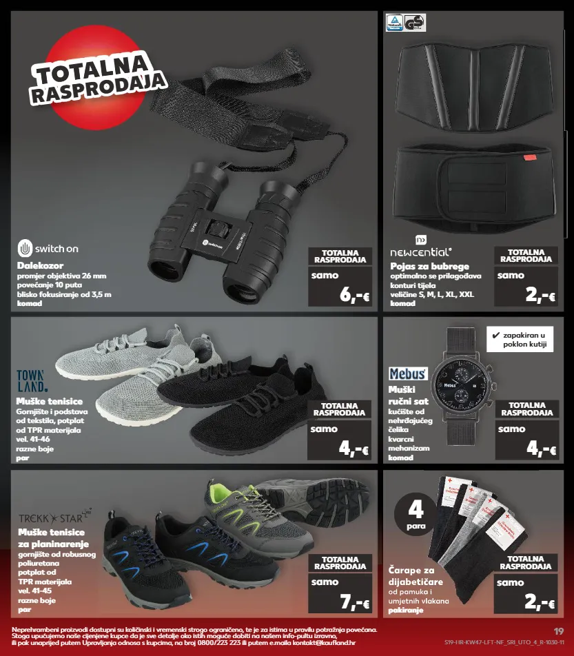 ✓ zapakiran u poklon kutiji dalekozor promjer objektiva 26 mm povećanje 10 puta blisko fokusiranje od 3,5 m komad muške tenisice za planinarenje gornjište od robusnog poliuretana potplat od tpr materijala vel. 41-45 razne boje par totalna rasprodaja totalna rasprodaja samo samo 7,- € 6,- € muške tenisice gornjište i podstava od tekstila, potplat od tpr materijala vel. 41-46 razne boje par muški ručni sat kućište od nehrđajućeg čelika kvarcni mehanizam komad totalna rasprodaja totalna rasprodaja samo samo 4,- € 4,- € pojas za bubrege optimalno se prilagođava konturi tijela veličine s, m, l, xl, xxl komad totalna rasprodaja samo 2,- € čarape za dijabetičare od pamuka i umjetnih vlakana pakiranje čarape za dijabetičare od pamuka i umjetnih vlakana totalna rasprodaja samo 2,- € 4 para totalna totalna r a spr od aj a rasprodaja neprehrambeni proizvodi dostupni su količinski i vremenski strogo ograničeno, te je za istima u pravilu potražnja povećana. stoga upućujemo naše cijenjene kupce da je sve detalje oko istih moguće dobiti na našem info-pultu izravno, ili pak unaprijed putem upravljanja odnosa s kupcima, na broj 0800/223 223 ili putem e.maila kontakt@kaufland.hr s19-hr-kw47-lft-nf_sri_uto_4_r-1030-11 19