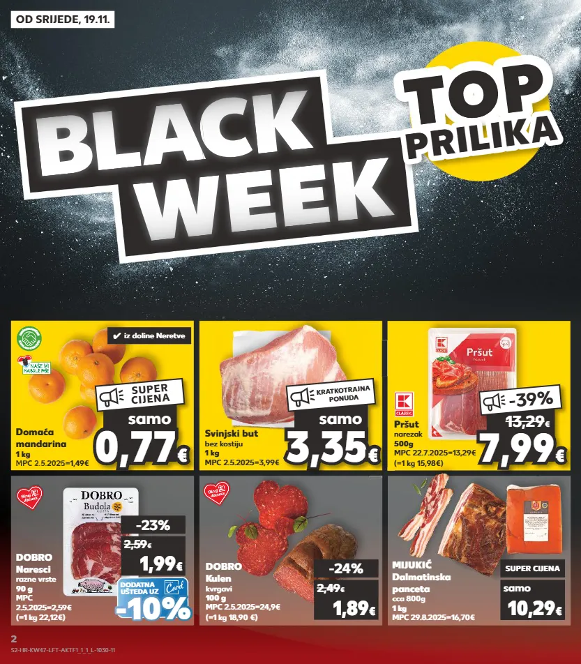 kratkotrajna ponuda kratkotrajna ponuda samo kratkotrajna ponuda samo od srijede, 19.11. bl a c a c c a k week top top top top prilik a prilika 0,7 7 0,77 € € samo super cijena 3,35 € samo kratkotrajna ponuda 7,99 7,99 € € -39 % 13,29 € domaća mandarina 1 kg mpc 2.5.2025=1,49€ (= 1 kg 0.99 €) mpc 2.5.2025=1,49€ (= 1 kg 0.99 €) mpc 2.5.2025=1,4 svinjski but bez kostiju 1 kg mpc 2.5.2025=3,99€ pršut narezak 500g mpc 22.7.2025=13,29€ (=1 kg 15,98€) mijukić dalmatinska panceta cca 800g 1 kg mpc 29.8.2025=16,70€ samo super cijena 10,29 € dobro kulen kvrgavi 100 g mpc 2.5.2025=24,9€ (=1 kg 18,90 €) -24% 1,89 € 2,49 € dodatna ušteda uz (=1 kg 22,12€) dobro naresci razne vrste 90 g mpc 2.5.2025=2,59€ -23% 1,99 € 2,59 € - - 10% 10% k a u f l a n d k v a l i t e t a o b e ć a n j e s v j e ž i n e ✓ iz doline neretve s2-hr-kw47-lft-aktf1_1_1_l-1030-11 2