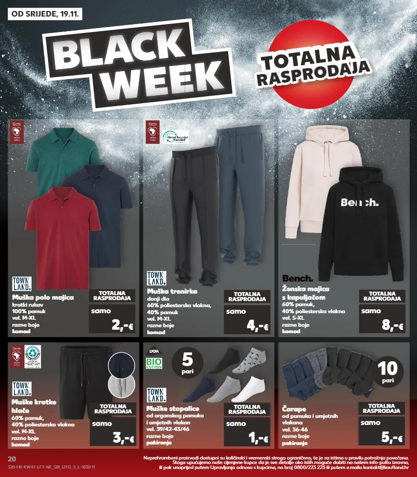 od srijede, 19.11. bl a c a c a k week totalna totalna totalna r a spr od aj a rasprodaja muška polo majica kratki rukav 100% pamuk vel. m-xl razne boje komad totalna rasprodaja samo 2,- € muške kratke hlače 60% pamuk, 40% poliesterska vlakna vel. m-xl razne boje komad totalna rasprodaja samo 3,- € ženska majica s kapuljačom 60% pamuk, 40% poliesterska vlakna vel. s-xl razne boje komad totalna rasprodaja samo 8,- € muške stopalice od organskog pamuka i umjetnih vlakan vel. 39/42-43/46 razne boje pakiranje totalna rasprodaja samo 1,- € muška trenirka donji dio 60% poliesterska vlakna, 40% pamuk vel. m-xl razne boje komad totalna rasprodaja samo 4,- € 5 pari čarape od pamuka i umjetnih vlakana vel. 36-46 razne boje pakiranje totalna rasprodaja samo 5,- € 10 pari neprehrambeni proizvodi dostupni su količinski i vremenski strogo ograničeno, te je za istima u pravilu potražnja povećana. stoga upućujemo naše cijenjene kupce da je sve detalje oko istih moguće dobiti na našem info-pultu izravno, ili pak unaprijed putem upravljanja odnosa s kupcima, na broj 0800/223 223 ili putem e.maila kontakt@kaufland.hr s20-hr-kw47-lft-nf_sri_uto_5_l-1030-11 20