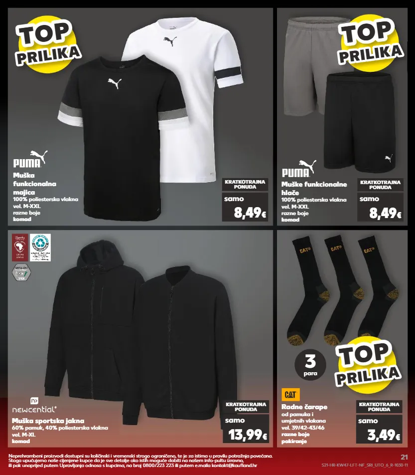 top top top prilik a prilika top top top prilik a prilika top top top prilik a prilika kratkotrajna ponuda samo 13,99 € kratkotrajna ponuda samo 8,49 € muške funkcionalne hlače 100% poliesterska vlakna vel. m-xxl razne boje komad muška funkcionalna majica 100% poliesterska vlakna vel. m-xxl razne boje komad kratkotrajna ponuda samo 8,49 € radne čarape od pamuka i umjetnih vlakana vel. 39/42-43/46 razne boje pakiranje kratkotrajna ponuda samo 3,49 € muška sportska jakna 60% pamuk, 40% poliesterska vlakna vel. m-xl komad 3 para neprehrambeni proizvodi dostupni su količinski i vremenski strogo ograničeno, te je za istima u pravilu potražnja povećana. stoga upućujemo naše cijenjene kupce da je sve detalje oko istih moguće dobiti na našem info-pultu izravno, ili pak unaprijed putem upravljanja odnosa s kupcima, na broj 0800/223 223 ili putem e.maila kontakt@kaufland.hr s21-hr-kw47-lft-nf_sri_uto_6_r-1030-11 21