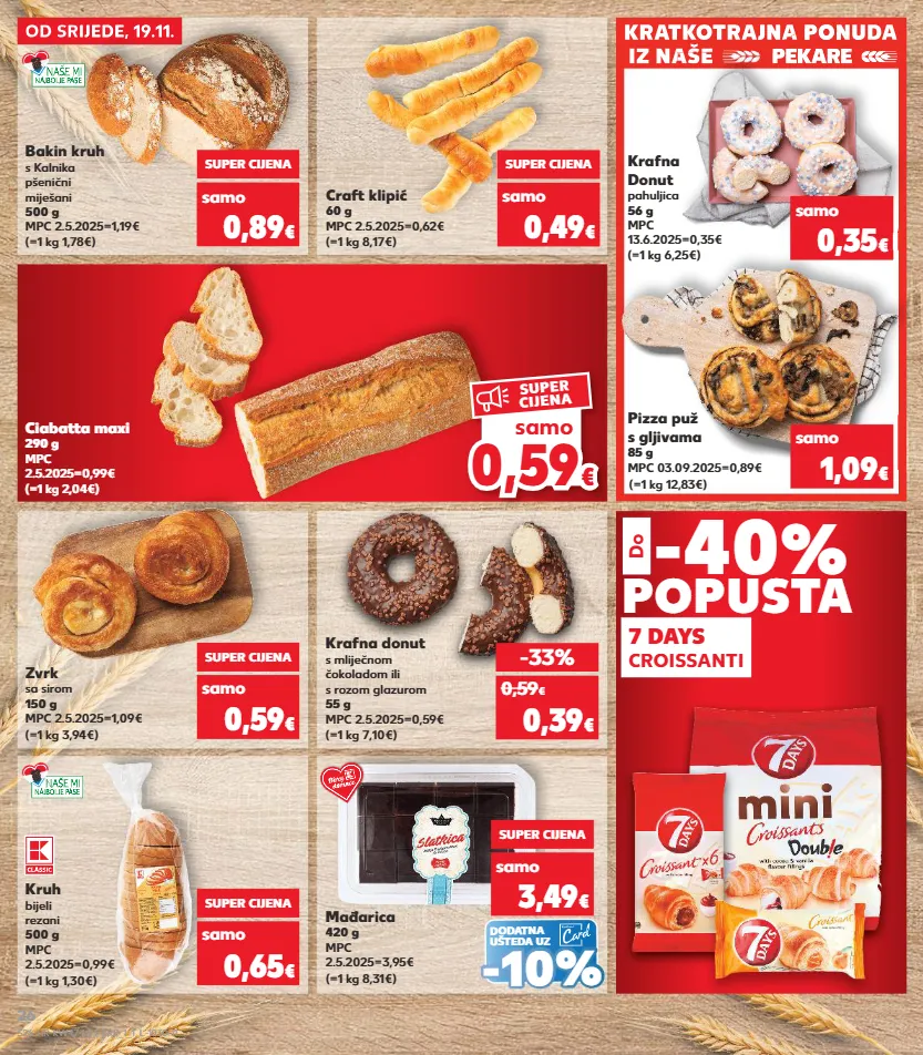 3,39 € kratkotrajna ponuda kratkotrajna ponuda kratkotrajna ponuda kratkotrajna ponuda kratkotrajna ponuda kratkotrajna ponuda kratkotrajna ponuda iz naše pekare od srijede, 19.11. od srijede, 19.11. pekare iz naše kratkotrajna ponuda pekare pekare -40 % popusta 7 days croissanti do samo krafna donut s mliječnom čokoladom ili s rozom glazurom 55 g mpc 2.5.2025=0,59€ (=1 kg 7,10€) pizza puž s gljivama 85 g mpc 03.09.2025=0,89€ (=1 kg 12,83€) zvrk sa sirom 150 g mpc 2.5.2025=1,09€ (=1 kg 3,94€) kruh bijeli rezani 500 g mpc 2.5.2025=0,99€ (=1 kg 1,30€) craft klipić 60 g mpc 2.5.2025=0,62€ (=1 kg 8,17€) super cijena samo 0,49 € -33% 0,39 € 0,59 € 1,09 € super cijena samo 0,59 € samo super cijena 0,65 € samo 0,35 € (=1 kg 6,25€) krafna donut pahuljica 56 g mpc 13.6.2025=0,35€ samo super cijena 0,89 € (=1 kg 1,78€) bakin kruh s kalnika pšenični miješani 500 g mpc 2.5.2025=1,19€ (=1 kg 2,04€) ciabatta maxi 290 g mpc 2.5.2025=0,99€ dodatna ušteda uz (=1 kg 8,31€) mađarica 420 g mpc 2.5.2025=3,95€ super cijena samo 3,49 € - - 10% 10% 0, 0, 59 59 € € samo super cijena s26-hr-kw47-lft-frp_1_1_l-1030-11 26