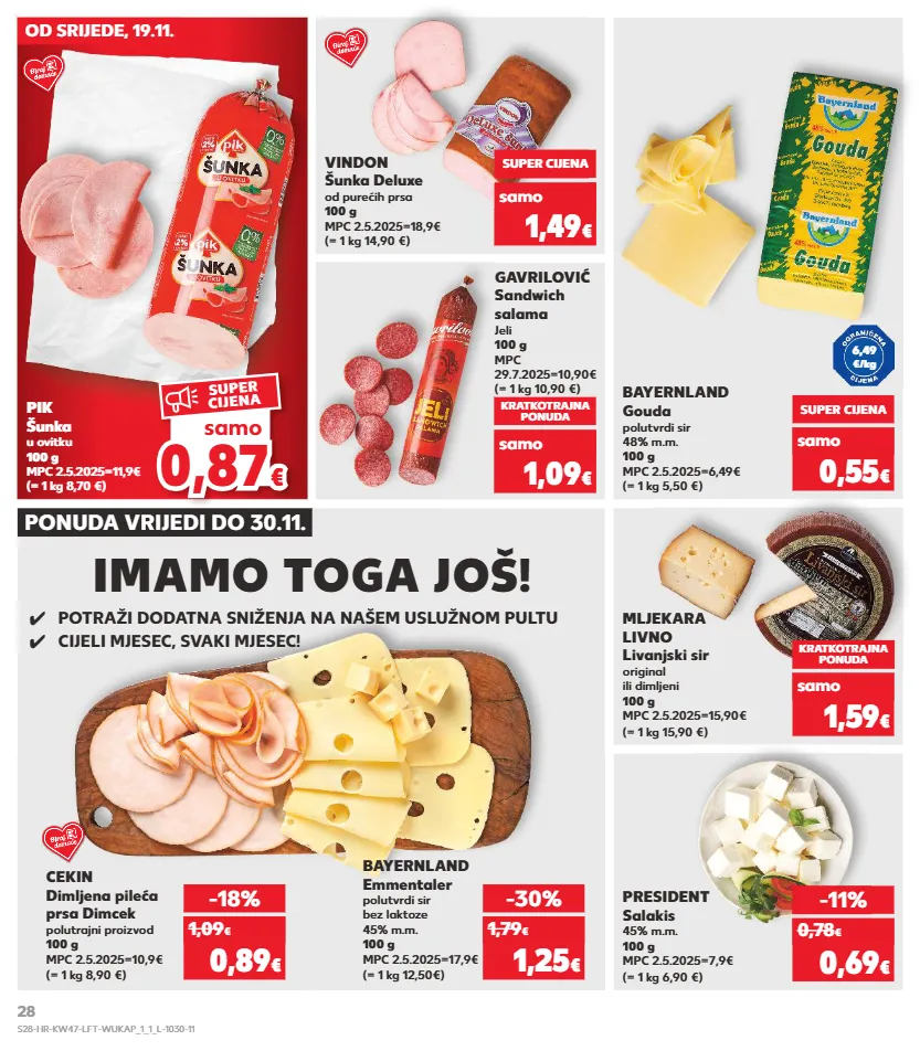 kratkotrajna ponuda kratkotrajna ponuda samo kratkotrajna ponuda samo kratkotrajna ponuda samo samo kratkotrajna ponuda samo mljekara livno livanjski sir original ili dimljeni 100 g mpc 2.5.2025=15,90€ (= 1 kg 15,90 €) bayernland gouda polutvrdi sir 48% m.m. 100 g mpc 2.5.2025=6,49€ (= 1 kg 5,50 €) president salakis 45% m.m. 100 g mpc 2.5.2025=7,9€ (= 1 kg 6,90 €) super cijena samo 0,55 € kratkotrajna ponuda samo 1,59 € -11% 0,69 € 0,78 € bayernland emmentaler polutvrdi sir bez laktoze 45% m.m. 100 g mpc 2.5.2025=17,9€ (= 1 kg 12,50€) -30% 1,25 € 1,79 € cekin dimljena pileća prsa dimcek polutrajni proizvod 100 g mpc 2.5.2025=10,9€ (= 1 kg 8,90 €) -18% 0,89 € 1,09 € kratkotrajna ponuda 1,09 € samo (= 1 kg 10,90 €) gavrilović sandwich salama jeli 100 g mpc 29.7.2025=10,90€ (= 1 kg 8,70 €) pik šunka u ovitku 100 g mpc 2.5.2025=11,9€ super cijena 1,49 € samo (= 1 kg 14,90 €) vindon šunka deluxe od purećih prsa 100 g mpc 2.5.2025=18,9€ 6,49 €/kg od srijede, 19.11. ✓ potraži dodatna sniženja na našem uslužnom pultu ✓ cijeli mjesec, svaki mjesec! ponuda vrijedi do 30.11. imamo toga još! 0,8 7 0,87 € € samo super cijena s28-hr-kw47-lft-wukap_1_1_l-1030-11 28