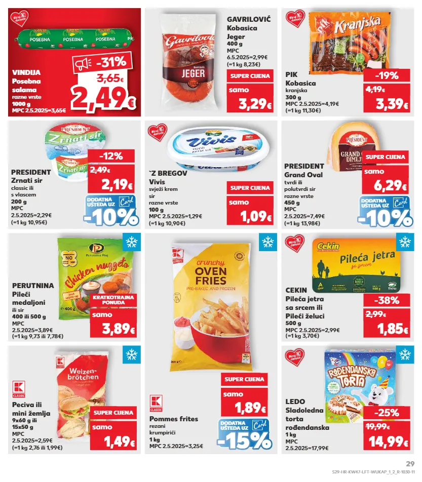 1,62 € kratkotrajna ponuda kratkotrajna ponuda samo kratkotrajna ponuda kratkotrajna ponuda kratkotrajna ponuda samo kratkotrajna ponuda kratkotrajna ponuda samo kratkotrajna ponuda samo kratkotrajna ponuda samo 6,29 € 6,29 € dodatna ušteda uz dodatna ušteda uz (=1 kg 10,95€) president zrnati sir classic ili s vlascem 200 g mpc 2.5.2025=2,29€ (=1 kg 13,98€) president grand oval tvrdi ili polutvrdi sir razne vrste 450 g mpc 2.5.2025=7,49€ -12% super cijena 2,19 € 2,49 € samo 6,29 € dodatna ušteda uz pommes frites rezani krumpirići 1 kg mpc 2.5.2025=3,25€ super cijena samo 1,89 € - - 15% 15% - - 10% 10% - - 10% 10% `z bregov vivis svježi krem sir razne vrste 100 g mpc 2.5.2025=1,29€ (=1 kg 10,90€) samo super cijena 1,09 € perutnina pileći medaljoni ili sir 400 ili 500 g mpc 2.5.2025=3,89€ (=1 kg 9,73 ili 7,78€) cekin pileća jetra sa srcem ili pileći želuci 500 g mpc 2.5.2025=2,99€ (=1 kg 3,70€) kratkotrajna ponuda samo 3,89 € -38% 1,85 € 2,99 € peciva ili mini žemlja 9x60 g ili 15x50 g mpc 2.5.2025=2,59€ (=1 kg 2,76 ili 1,99€) ledo sladoledna torta rođendanska 1 kg mpc 2.5.2025=17,99€ samo super cijena 1,49 € -25% 14,99 € 19,99 € (=1 kg 8,23€) gavrilović kobasica jeger 400 g mpc 6.5.2025=2,99€ super cijena 3,29 € samo vindija posebna salama razne vrste 1000 g mpc 2.5.2025=3,65€ (=1 kg 11,30€) pik kobasica kranjska 300 g mpc 2.5.2025=4,19€ -19% 3,39 € 4,19 € 2,4 9 2,49 € € -31 % 3,65 € s29-hr-kw47-lft-wukap_1_2_r-1030-11 29