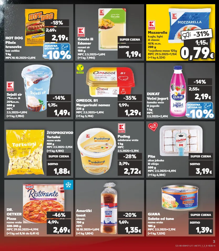 kratkotrajna ponuda samo kratkotrajna ponuda samo kratkotrajna ponuda kratkotrajna ponuda samo kratkotrajna ponuda kratkotrajna ponuda samo kratkotrajna ponuda samo kratkotrajna ponuda kratkotrajna ponuda kratkotrajna ponuda samo kratkotrajna ponuda samo 0,7 9 0,79 € € -31 % 1,15 € svježi sir 7%m.m. ili 20%m.m. 500 g mpc 2.5.2025=1,89€ (=1 kg 2,98€) -14% 1,49 € 1,75 € omegol b1 margarinski namaz 225 g mpc 2.5.2025=1,49€ (=1 kg 5,74€) -35% 1,29 € 1,99 € žitoproizvod tortelini razne vrste 450 g mpc 2.5.2025=3,95€ (=1 kg 4,18€) puding odabrane vrste 1 kg mpc 2.5.2025=3,39€ pita okus jabuka ili višnja 500 g mpc 2.5.2025=4,49€ (=1 kg 6,38€) samo super cijena 1,88 € -28% 2,72 € 3,79 € samo super cijena 3,19 € dr. oetker pizza razne vrste 320-345 g mpc 29.05.2025=4,99€ (=1 kg od 8,16 do 8,41 €) američki toast classic 750 g mpc 18.10.2025=1,69€ (=1 kg 1,80€) giana salata od tune razne vrste 185 g mpc 2.5.2025=2,19€ (=1 kg 7,52€) -46% 2,69 € 4,99 € -20% 1,35 € 1,69 € samo super cijena 1,39 € (=1 kg 7,94€) gouda ili edamer rezani sir 150 g mpc 2.5.2025=1,69€ samo super cijena 1,19 € (=1 kg 6,32€) mozzarella kugla, light ili classic 45% m.m. 200 g *ocjeđena masa 125g mpc 29.5.2025=1,15€ dodatna ušteda uz dodatna ušteda uz dukat voćni jogurt šumsko voće ili jagoda 1 kg mpc 2.5.2025=2,49€ hot dog pileće hrenovke bez ovitka 1 kg mpc10.10.2025=2,69€ -14% 2,19 € 2,55 € -18% 2,19 € 2,69 € - - 10% 10% - - 10% 10% s3-hr-kw47-lft-aktf1_1_2_r-1030-11 3