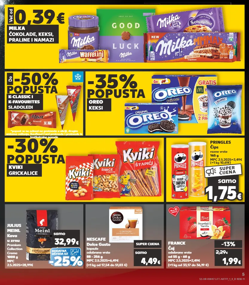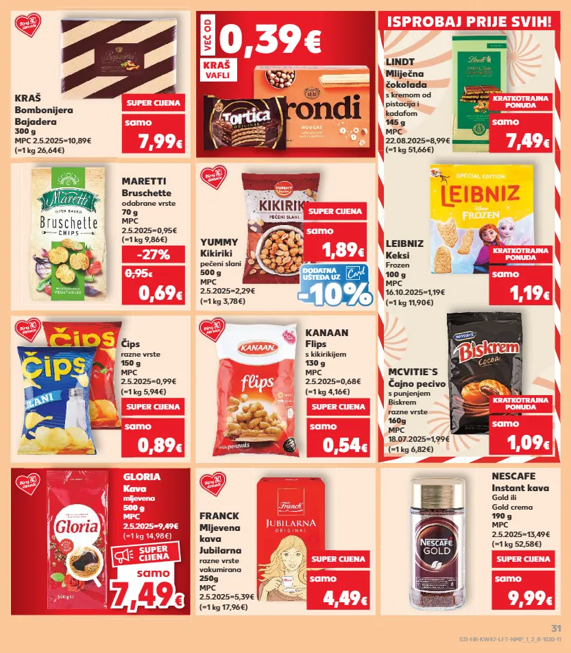 1,89 € kratkotrajna ponuda kratkotrajna ponuda kratkotrajna ponuda kratkotrajna ponuda kratkotrajna ponuda kratkotrajna ponuda kratkotrajna ponuda isprobaj prije svih! isprobaj prije svih! kraš vafli 0,39 € već od samo leibniz keksi frozen 100 g mpc 16.10.2025=1,19€ (=1 kg 11,90€) kraš bombonijera bajadera 300 g mpc 2.5.2025=10,89€ (=1 kg 26,64€) samo super cijena 7,99 € kratkotrajna ponuda 1,19 € čips razne vrste 150 g mpc 2.5.2025=0,99€ (=1 kg 5,94€) kanaan flips s kikirikijem 130 g mpc 2.5.2025=0,68€ (=1 kg 4,16€) mcvitie`s čajno pecivo s punjenjem biskrem razne vrste 160g mpc 18.07.2025=1,99€ (=1 kg 6,82€) samo super cijena 0,89 € samo super cijena 0,54 € kratkotrajna ponuda samo 1,09 € franck mljevena kava jubilarna razne vrste vakumirana 250g mpc 2.5.2025=5,39€ (=1 kg 17,96€) nescafe instant kava gold ili gold crema 190 g mpc 2.5.2025=13,49€ (=1 kg 52,58€) samo super cijena 4,49 € gloria kava mljevena 500 g mpc 2.5.2025=9,49€ (=1 kg 14,98€) samo super cijena 9,99 € 0,95 € (=1 kg 9,86€) maretti bruschette odabrane vrste 70 g mpc 2.5.2025=0,95€ -27% 0,69 € (=1 kg 51,66€) lindt mliječna čokolada s kremom od pistacija i kadafom 145 g mpc 22.08.2025=8,99€ kratkotrajna ponuda samo 7,49 € dodatna ušteda uz (=1 kg 3,78€) yummy kikiriki pečeni slani 500 g mpc 2.5.2025=2,29€ super cijena samo 1,89 € - - 10% 10% (=1 kg 14,98€) 7,4 9 7,49 € € samo super cijena s31-hr-kw47-lft-nmp_1_2_r-1030-11 31