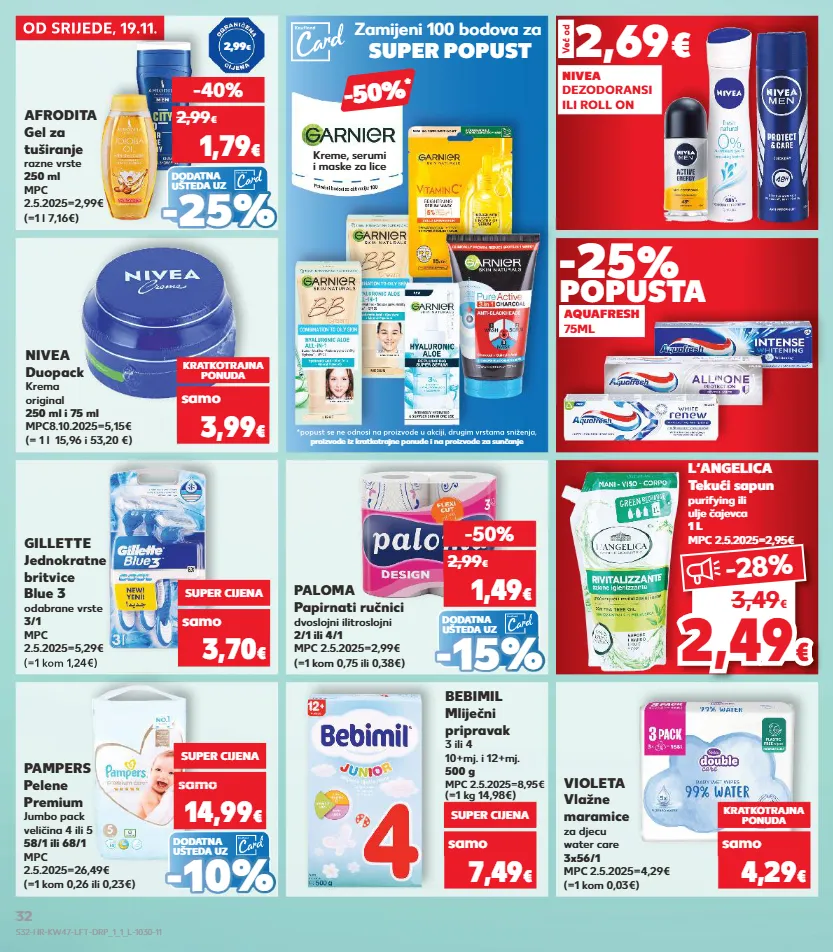 kratkotrajna ponuda samo samo kratkotrajna ponuda samo samo kratkotrajna ponuda samo kratkotrajna ponuda kratkotrajna ponuda samo 2,69 € nivea dezodoransi ili roll on već od aquafresh 75ml -25 % popusta 2,4 9 2,49 € € -28 % 3,49 € od srijede, 19.11. zamijeni 100 bodova za super popust -50% * *popust se ne odnosi na proizvode u akciji, drugim vrstama sniženja, proizvode iz kratkotrajne ponude i na proizvode za sunčanje kreme, serumi i maske za lice od srijede, 19.11. gillette jednokratne britvice blue 3 odabrane vrste 3/1 mpc 2.5.2025=5,29€ (=1 kom 1,24€) nivea duopack krema original 250 ml i 75 ml mpc8.10.2025=5,15€ (= 1 l 15,96 i 53,20 €) bebimil mliječni pripravak 3 ili 4 10+mj. i 12+mj. 500 g mpc 2.5.2025=8,95€ (=1 kg 14,98€) violeta vlažne maramice za djecu water care 3x56/1 mpc 2.5.2025=4,29€ (=1 kom 0,03€) super cijena 3,70 € samo kratkotrajna ponuda 3,99 € samo super cijena 7,49 € samo kratkotrajna ponuda 4,29 € samo l‘angelica tekući sapun purifying ili ulje čajevca 1 l mpc 2.5.2025=2,95€ (=1 kom 1,24€) dodatna ušteda uz dodatna ušteda uz (=1 kom 0,75 ili 0,38€) paloma papirnati ručnici dvoslojni ilitroslojni 2/1 ili 4/1 mpc 2.5.2025=2,99€ (=1 kom 0,26 ili 0,23€) pampers pelene premium jumbo pack veličina 4 ili 5 58/1 ili 68/1 mpc 2.5.2025=26,49€ -50% 1,49 € 2,99 € super cijena samo 14,99 € sa 16,49 samo 16,49 samo 16,49 samo 16,49 samo samo € dodatna ušteda uz (=1 l 7,16€) afrodita gel za tuširanje razne vrste 250 ml mpc 2.5.2025=2,99€ -40% 1,79 € 2,99 € - - 25 % 25 % - - 15% 15% - - 10% 10% 2,99 € *popust se ne odnosi na proizvode u akciji, drugim vrstama sniženja, *popust se ne odnosi na proizvode u akciji, drugim vrstama sniženja, s32-hr-kw47-lft-drp_1_1_l-1030-11 32
