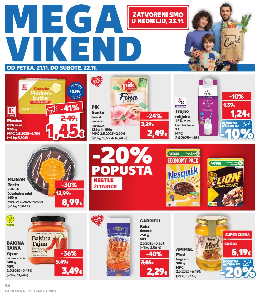 kratkotrajna ponuda samo kratkotrajna ponuda samo kratkotrajna ponuda samo kratkotrajna ponuda samo kratkotrajna ponuda samo kratkotrajna ponuda zatvoreni smo u nedjelju, 23.11. vikend mega od petka, 21.11. do subote, 22.11. zatvoreni smo , 23.11. -20% nestle žitarice popusta pik šunka fina ili pečena narezak 125g ili 150g mpc 2.5.2025=2,99€ (=1 kg 19,92 ili 16,60 €) gabrieli keksi domaći 750 g mpc 2.5.2025=3,85€ -24% 2,49 € 3,29 € bakina tajna ajvar razne vrste 300 g mpc 2.5.2025=5,49€ (=1 kg 11,64€) -36% 3,49 € 5,49 € mlinar torta jaffa ili čokoladna mini 650 g mpc 21.5.2025=12,99€ (=1 kg 13,84€) (=1 kg 3,06 €) -30% 8,99 € 12,99 € -40% 2,29 € 3,85 € dodatna ušteda uz trajno mlijeko 1,5% m.m. bez laktoze 1 l mpc 2.5.2025=1,55€ bez laktoze -10% 1,24 € 1,39 € dodatna ušteda uz (=1 kg 5,77€) apimel med bagrem 900 g mpc 2.5.2025=6,49€ samo super cijena 5,19 € o 5,19 sam 5,19 sam 5,19 sam 5,19 sam samo o € o - - 20 % 20 % - - 10% 10% maslac 82% m.m. 250 g mpc 2.5.2025=2,75€ (=1 kg 5,80€) 2,99 € 1,4 5 1,45 € € -41 % 2,49 € s36-hr-kw47-lft-vp_2_ned_3_l-1030-11 36