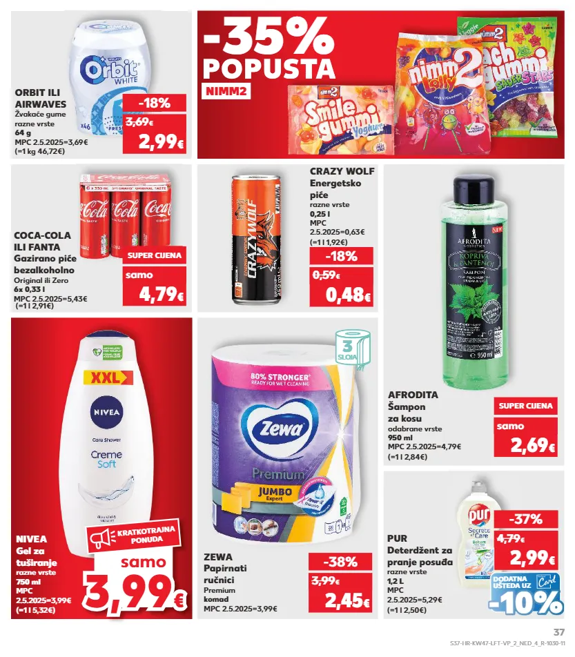 kratkotrajna ponuda samo kratkotrajna ponuda samo kratkotrajna ponuda samo kratkotrajna ponuda samo kratkotrajna ponuda samo kratkotrajna ponuda samo -35% nimm2 popusta popusta 3 sloja 3,99 3,99 € € samo kratkotrajna ponuda crazy wolf energetsko piće razne vrste 0,25 l mpc 2.5.2025=0,63€ (=1 l 1,92€) nivea gel za tuširanje razne vrste 750 ml mpc 2.5.2025=3,99€ (=1 l 5,32€) -18% 0,48 € 0,59 € afrodita šampon za kosu odabrane vrste 950 ml mpc 2.5.2025=4,79€ (=1 l 2,84€) super cijena 2,69 € samo zewa papirnati ručnici premium komad mpc 2.5.2025=3,99€ -38% 2,45 € 3,99 € (=1 kg 46,72€) orbit ili airwaves žvakaće gume razne vrste 64 g mpc 2.5.2025=3,69€ -18% 2,99 € 3,69 € (=1 l 2,91€) coca-cola ili fanta gazirano piće bezalkoholno original ili zero 6x 0,33 l mpc 2.5.2025=5,43€ super cijena 4,79 € samo dodatna ušteda uz (=1 l 2,50€) pur deterdžent za pranje posuđa razne vrste 1,2 l mpc 2.5.2025=5,29€ -37% 2,99 € 4,79 € - - 10% 10% s37-hr-kw47-lft-vp_2_ned_4_r-1030-11 37