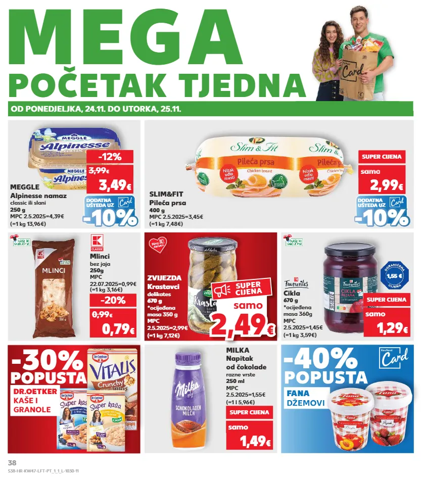 kratkotrajna ponuda samo kratkotrajna ponuda samo kratkotrajna ponuda samo kratkotrajna ponuda kratkotrajna ponuda samo od ponedjeljka, 24.11. do utorka, 25.11. početak tjedna mega 2,4 9 2,49 € € samo super cijena -40% popusta fana džemovi zvijezda krastavci delikates 670 g *ocijeđena masa 350 g mpc 2.5.2025=2,99€ (=1 kg 7,12€) mlinci bez jaja 250g mpc 22.07.2025=0,99€ (=1 kg 3,16€) cikla 670 g *ocijeđena masa 360g mpc 2.5.2025=1,45€ (=1 kg 3,59€) milka napitak od čokolade razne vrste 250 ml mpc 2.5.2025=1,55€ (=1 l 5,96€) -20% 0,79 € 0,99 € super cijena 1,29 € super cijena 1,49 € samo dodatna ušteda uz dodatna ušteda uz (=1 kg 7,48€) slim&fit pileća prsa 400 g mpc 2.5.2025=3,45€ samo super cijena 2,99 € o 2,99 samo 2,99 samo 2,99 samo 2,99 samo samo € o € o (=1 kg 13,96€) meggle alpinesse namaz classic ili slani 250 g mpc 2.5.2025=4,39€ -12% 3,49 € 3,99 € - - 10% 10% - - 10% 10% 1,55 € -30 % popusta dr.oetker kaše i granole samo popusta popusta džemovi popusta s38-hr-kw47-lft-pt_1_1_l-1030-11 38