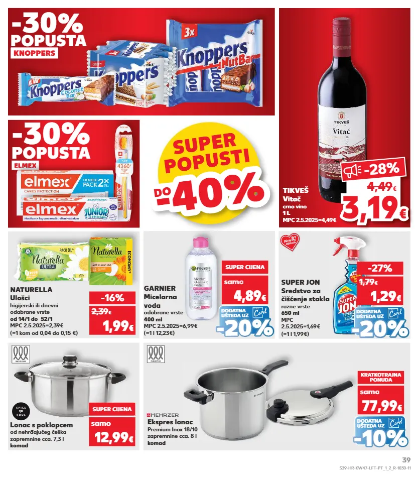 -35% 19,99 € kratkotrajna ponuda kratkotrajna ponuda samo kratkotrajna ponuda kratkotrajna ponuda samo elmex -30% popusta super popusti popusti -40% -40% do elmex 3,19 € € -28 % 4,49 € tikveš vitač crno vino 1 l mpc 2.5.2025=4,49€ lonac s poklopcem od nehrđajućeg čelika zapremnine cca. 7,3 l komad samo 12,99 € naturella ulošci higijenski ili dnevni odabrane vrste od 14/1 do 52/1 mpc 2.5.2025=2,39€ (=1 kom od 0,04 do 0,15 €) -16% 1,99 € 2,39 € dodatna ušteda uz dodatna ušteda uz (=1 l 12,23€) garnier micelarna voda odabrane vrste 400 ml mpc 2.5.2025=6,99€ ekspres lonac premium inox 18/10 zapremnine cca. 8 l komad super cijena kratkotrajna ponuda samo 4,89 € sa o 4,89 samo 4,89 samo 4,8 samo 4,89 samo samo € o € o samo 77,99 € sa 77,99 samo 77,99 samo 7,99 samo 77,99 samo samo € dodatna ušteda uz (=1 l 1,99€) super jon sredstvo za čišćenje stakla razne vrste 650 ml mpc 2.5.2025=1,69€ -27% 1,29 € 1,79 € - - 20 % 20 % - - 20 % 20 % - - 10% 10% -30 % popusta knoppers super cijena s39-hr-kw47-lft-pt_1_2_r-1030-11 39