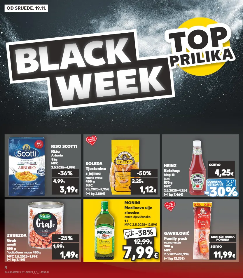 kratkotrajna ponuda samo kratkotrajna ponuda samo kratkotrajna ponuda samo od srijede, 19.11. bl a c a c a k week top top top top prilik a prilika 7,99 7,99 € € -38% 12,99 € koleda tjestenina s jajima razne vrste 400 g mpc 2.5.2025=2,25€ (=1 kg 2,80€) riso scotti riža arborio 1 kg mpc 2.5.2025=4,99€ monini maslinovo ulje classico extra djevičansko 1 l mpc 2.5.2025=12,59€ gavrilović family pack razne vrste 900 g mpc 2.5.2025=10,99€ (=1 kg 13,33€) zvijezda grah smeđi 800 g *ocijeđena masa 480g mpc 2.5.2025=1,99€ (=1 kg 3,11€) -25% 1,49 € 1,99 € -50% 1,12 € 2,25 € -36% 3,19 € 4,99 € kratkotrajna ponuda samo 11,99 € (=1 kg 7,46€) heinz ketchup blagi ili ljuti 570 g mpc 2.5.2025=4,25€ samo 4,25 € - - 30% 30% dodatna ušteda uz s4-hr-kw47-lft-aktf1_1_3_l-1030-11 4