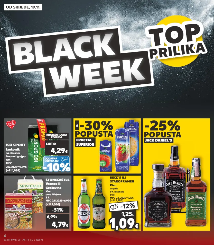kratkotrajna ponuda samo od srijede, 19.11. bl a c a c a k week top top top top prilik a prilika -25% popusta jack daniel‘s stonecastle vranac ili graševina vino crno ili bijelo 3 l mpc 2.5.2025=6,99€ (=1 l 1,60€) 1,09 1,09 € € -12% 1,25 € beck`s ili staropramen pivo svijetlo 5% alkohola 0,5 l mpc 2.5.2025=1,25€ (=1 l 2,18€) -31% 4,79 € 6,99 € dodatna ušteda uz (=1 l 1,08€) iso sport izotonik sa okusom limuna i grejpa 4/1 mpc 2.5.2025=4,29€ kratkotrajna ponuda samo 4,29 € - - 10% 10% -30% popusta do fructal superior popusta s6-hr-kw47-lft-aktf1_1_5_l-1030-11 6