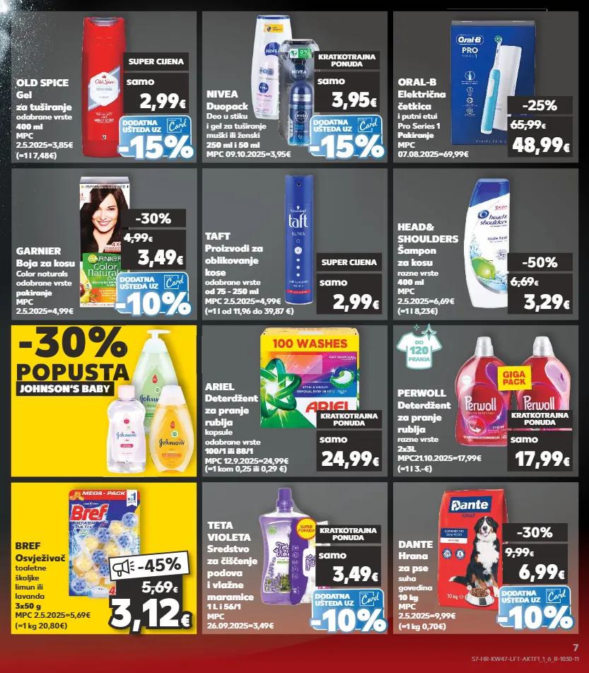 kratkotrajna ponuda kratkotrajna ponuda samo kratkotrajna ponuda samo kratkotrajna ponuda kratkotrajna ponuda kratkotrajna ponuda samo samo -30% popusta johnson‘s baby -30% popusta popusta johnson‘s baby popusta head& shoulders šampon za kosu razne vrste 400 ml mpc 2.5.2025=6,69€ (=1 l 8,23€) taft proizvodi za oblikovanje kose odabrane vrste od 75 - 250 ml mpc 2.5.2025=4,99€ (=1 l od 11,96 do 39,87 €) samo super cijena 2,99 € -50% 3,29 € 6,69 € ariel deterdžent za pranje rublja kapsule odabrane vrste 100/1 ili 88/1 mpc 12.9.2025=24,99€ (=1 kom 0,25 ili 0,29 €) perwoll deterdžent za pranje rublja razne vrste 2x3l mpc21.10.2025=17,99€ (=1 l 3.-€) kratkotrajna ponuda samo 24,99 € kratkotrajna ponuda samo 17,99 € 3,12 3,12 € € -45 % 5,69 € bref osvježivač toaletne školjke limun ili lavanda 3x50 g mpc 2.5.2025=5,69€ (=1 kg 20,80€) oral-b električna četkica i putni etui pro series 1 pakiranje mpc 07.08.2025=69,99€ -25% 48,99 € 65,99 € dodatna ušteda uz dodatna ušteda uz dodatna ušteda uz dodatna ušteda uz nivea duopack deo u stiku i gel za tuširanje muški ili ženski 250 ml i 50 ml mpc 09.10.2025=3,95€ (=1 l 7,48€) old spice gel za tuširanje odabrane vrste 400 ml mpc 2.5.2025=3,85€ garnier boja za kosu color naturals odabrane vrste pakiranje mpc 2.5.2025=4,99€ (=1 kg 0,70€) dante hrana za pse suha govedina 10 kg mpc 2.5.2025=9,99€ kratkotrajna ponuda super cijena samo 3,95 € samo 2,99 € -30% -30% 3,49 € 4,99 € 6,99 € 9,99 € - - 15% 15% - - 15% 15% dodatna ušteda uz teta violeta sredstvo za čišćenje podova i vlažne maramice 1 l i 56/1 mpc 26.09.2025=3,49€ kratkotrajna ponuda samo 3,49 € - - 10% 10% - - 10% 10% - - 10% 10% do 120 pranja s7-hr-kw47-lft-aktf1_1_6_r-1030-11 7