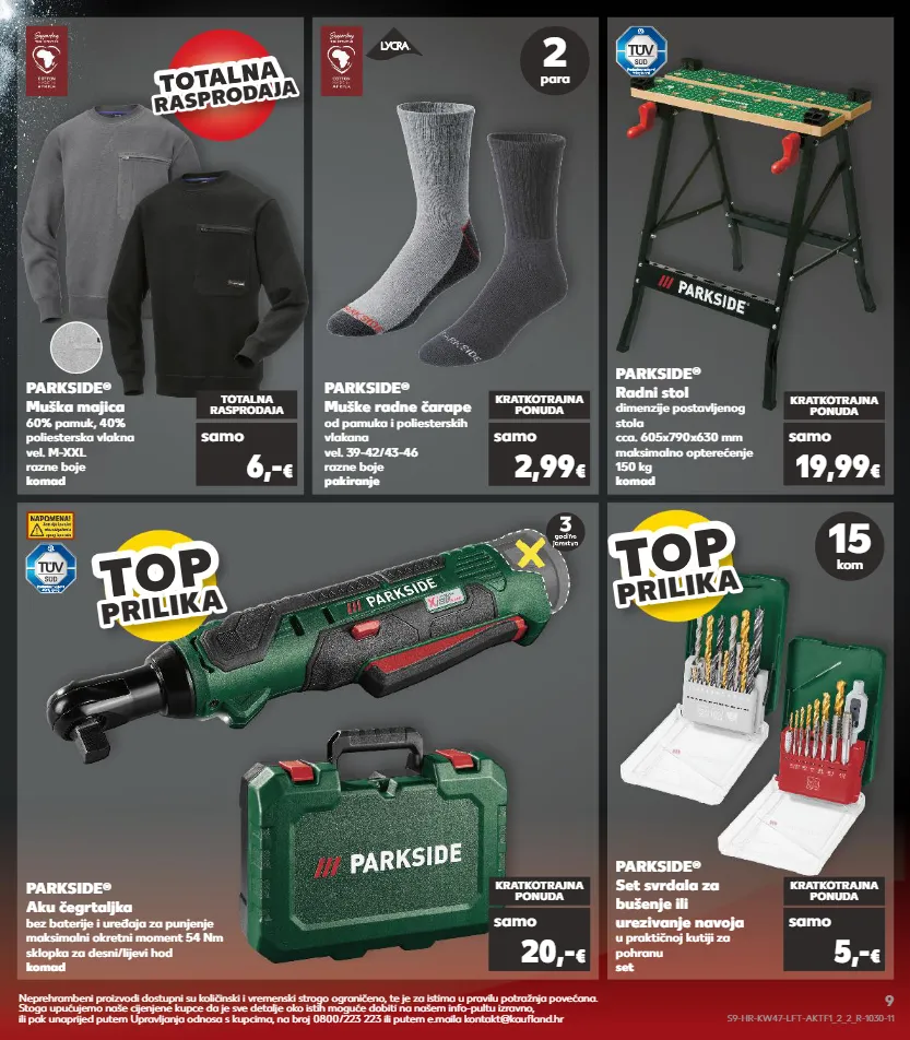 parkside ® muška majica 60% pamuk, 40% poliesterska vlakna vel. m-xxl razne boje komad totalna rasprodaja samo 6,- € parkside ® radni stol dimenzije postavljenog stola cca. 605x790x630 mm maksimalno opterećenje 150 kg komad parkside ® aku čegrtaljka bez baterije i uređaja za punjenje maksimalni okretni moment 54 nm sklopka za desni/lijevi hod komad parkside ® set svrdala za bušenje ili urezivanje navoja u praktičnoj kutiji za pohranu set kratkotrajna ponuda kratkotrajna ponuda kratkotrajna ponuda samo samo samo 19,99 € 20,- € 5,- € parkside ® muške radne čarape od pamuka i poliesterskih vlakana vel. 39-42/43-46 razne boje pakiranje kratkotrajna ponuda samo 2,99 € 15 kom 2 para top top top top prilik a prilika top top top top prilik a prilika totalna totalna totalna r a spr od aj a rasprodaja neprehrambeni proizvodi dostupni su količinski i vremenski strogo ograničeno, te je za istima u pravilu potražnja povećana. stoga upućujemo naše cijenjene kupce da je sve detalje oko istih moguće dobiti na našem info-pultu izravno, ili pak unaprijed putem upravljanja odnosa s kupcima, na broj 0800/223 223 ili putem e.maila kontakt@kaufland.hr s9-hr-kw47-lft-aktf1_2_2_r-1030-11 9
