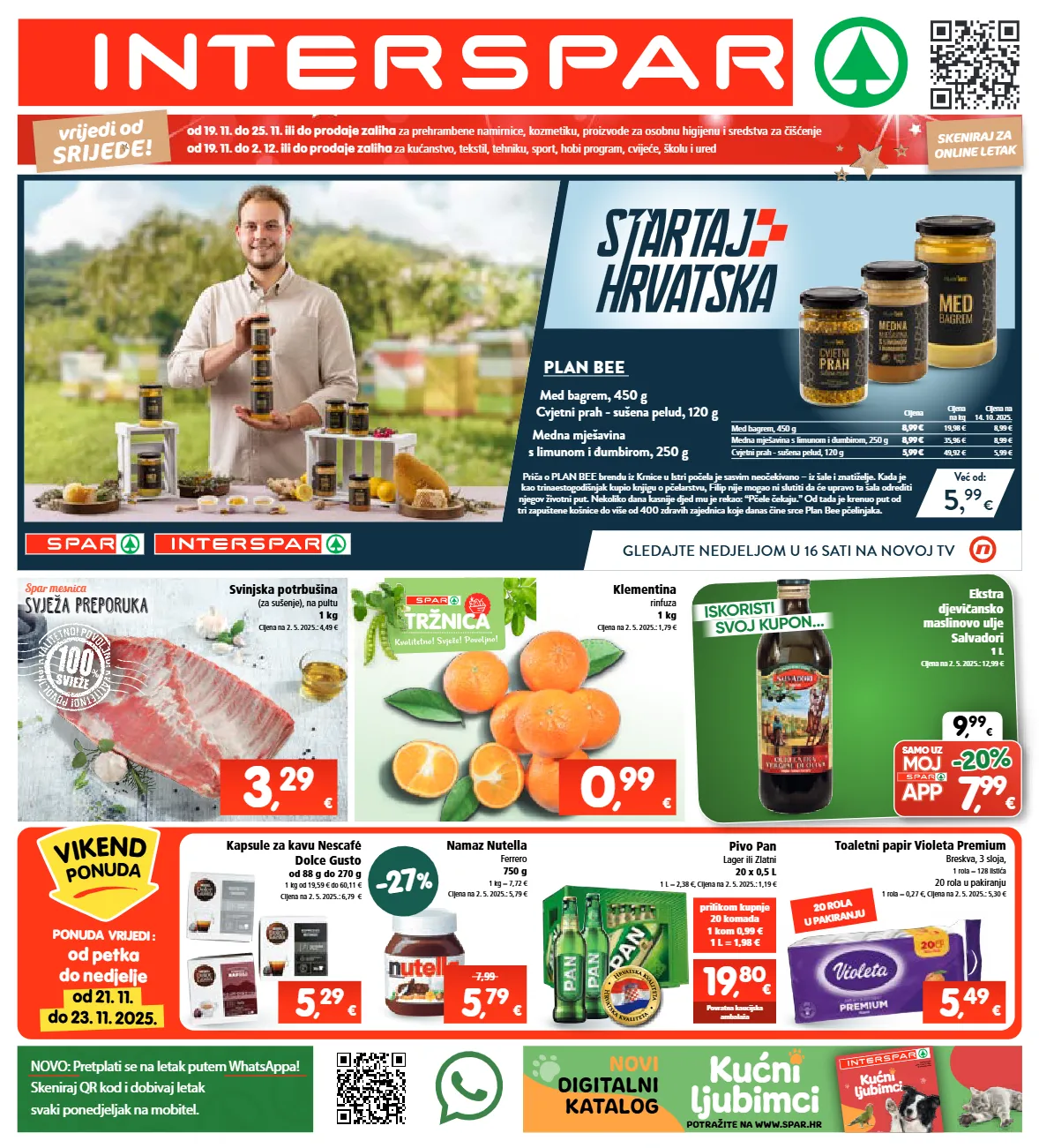 v i k e n d p o n u d a plan bee med bagrem, 450 g cvjetni prah - sušena pelud, 120 g medna mješavina s limunom i đumbirom, 250 g priča o plan bee brendu iz krnice u istri počela je sasvim neočekivano – iz šale i znatiželje. kada je kao trinaestogodišnjak kupio knjigu o pčelarstvu, filip nije mogao ni slutiti da će upravo ta šala odrediti njegov životni put. nekoliko dana kasnije djed mu je rekao: “pčele čekaju.” od tada je krenuo put od tri zapuštene košnice do više od 400 zdravih zajednica koje danas čine srce plan bee pčelinjaka. 5, 99 € već od: cijena cijena na kg cijena na 14. 10. 2025. med bagrem, 450 g 8,99 € 19,98 € 8,99 € medna mješavina s limunom i đumbirom, 250 g 8,99 € 35,96 € 8,99 € cvjetni prah - sušena pelud, 120 g 5,99 € 49,92 € 5,99 € gledajte nedjeljom u 16 sati na novoj tv novo: pretplati se na letak putem whatsappa! skeniraj qr kod i dobivaj letak svaki ponedjeljak na mobitel. kućni ljubimci trajanje ponude od 19. 11. do 2. 12. 2025. ili do prodaje zaliha ljubimci kućni potražite na www.spar.hr novi digitalni katalog klementina rinfuza 1 kg cijena na 2. 5. 2025.: 1,79 € 0 , 99 € tržnica 3 , 29 € ponuda vrijedi : od petka do nedjelje od 21. 11. do 23. 11. 2025. svje ž a preporuka spar mesnica svinjska potrbušina (za sušenje), na pultu 1 kg cijena na 2. 5. 2025.: 4,49 € iskoristi svoj kupon... 9 , 99 € samo uz 7 , 99 € -20% -20% ekstra djevičansko maslinovo ulje salvadori 1 l cijena na 2. 5. 2025.: 12,99 € kapsule za kavu nescafé dolce gusto od 88 g do 270 g 1 kg od 19,59 € do 60,11 € cijena na 2. 5. 2025.: 6,79 € namaz nutella ferrero 750 g 1 kg = 7,72 € cijena na 2. 5. 2025.: 5,79 € toaletni papir violeta premium breskva, 3 sloja, 1 rola = 128 listića 20 rola u pakiranju 1 rola = 0,27 €, cijena na 2. 5. 2025.: 5,30 € 20 rola u pakiranju 5 , 29 € 5 , 49 € pivo pan lager ili zlatni 20 x 0,5 l 1 l = 2,38 €, cijena na 2. 5. 2025.: 1,19 € h r v a t s k a k v a l i t e t a h r v a t s k a k v a l i t e t a povratna kaucijska ambalaža 19 , 80 € prilikom kupnje 20 komada 1 kom 0,99 € 1 l = 1,98 € od 19. 11. do 2. 12. ili do prodaje zaliha za kućanstvo, tekstil, tehniku, sport, hobi program, cvijeće, školu i ured vrijedi od srijede! skeniraj za online letak 5 , 79 € 7,99 -27 % od 19. 11. do 25. 11. ili do prodaje zaliha za prehrambene namirnice, kozmetiku, proizvode za osobnu higijenu i sredstva za čišćenje