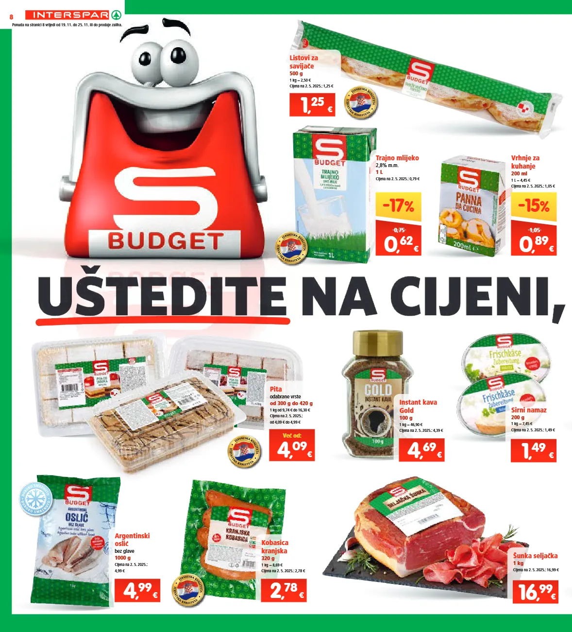 šunka seljačka 1 kg cijena na 2. 5. 2025.: 16,99 € 16 , 99 € kobasica kranjska 320 g 1 kg = 8,69 € cijena na 2. 5. 2025.: 2,78 € 2 , 78 € sirni namaz 200 g 1 kg = 7,45 € cijena na 2. 5. 2025.: 1,49 € 1 , 49 € pita odabrane vrste od 300 g do 420 g 1 kg od 9,74 € do 16,30 € cijena na 2. 5. 2025.: od 4,09 € do 4,99 € 4 , 09 € već od: argentinski oslić bez glave 1000 g cijena na 2. 5. 2025.: 4,99 € vrhnje za kuhanje 200 ml 1 l = 4,45 € cijena na 2. 5. 2025.: 1,05 € 0 , 89 € 1,05 -15 % trajno mlijeko 2,8% m.m. 1 l cijena na 2. 5. 2025.: 0,79 € 0 , 62 € 0,75 -17 % h r v a t s k a k v a l i t e t a h r v a t s k a k v a l i t e t a h r v a t s k a k v a l i t e t a h r v a t s k a k v a l i t e t a h r v a t s k a k v a l i t e t a h r v a t s k a k v a l i t e t a h r v a t s k a k v a l i t e t a h r v a t s k a k v a l i t e t a instant kava gold 100 g 1 kg = 46,90 € cijena na 2. 5. 2025.: 4,39 € 4 , 69 € listovi za savijače 500 g 1 kg = 2,50 € cijena na 2. 5. 2025.: 1,25 € 1 , 25 € 4 , 99 € ponuda na stranici 8 vrijedi od 19. 11. do 25. 11. ili do prodaje zaliha. 8