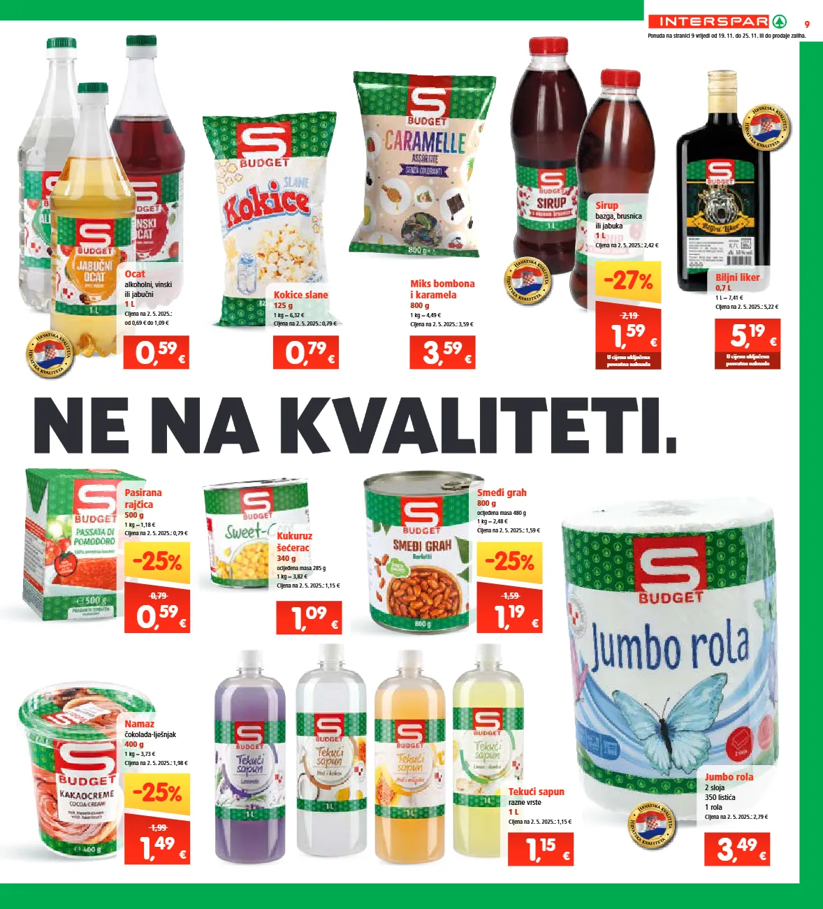 kukuruz šećerac 340 g ocijeđena masa 285 g 1 kg = 3,82 € cijena na 2. 5. 2025.: 1,15 € 1 , 09 € tekući sapun razne vrste 1 l cijena na 2. 5. 2025.: 1,15 € 1 , 15 € jumbo rola 2 sloja 350 listića 1 rola cijena na 2. 5. 2025.: 2,79 € 3 , 49 € kokice slane 125 g 1 kg = 6,32 € cijena na 2. 5. 2025.: 0,79 € 0 , 79 € miks bombona i karamela 800 g 1 kg = 4,49 € cijena na 2. 5. 2025.: 3,59 € 3 , 59 € biljni liker 0,7 l 1 l = 7,41 € cijena na 2. 5. 2025.: 5,22 € 5 , 19 € u cijenu uključena povratna naknada sirup bazga, brusnica ili jabuka 1 l cijena na 2. 5. 2025.: 2,42 € 1 , 59 € 2,19 -27 % u cijenu uključena povratna naknada smeđi grah 800 g ocijeđena masa 480 g 1 kg = 2,48 € cijena na 2. 5. 2025.: 1,59 € 1 , 19 € 1,59 -25 % pasirana rajčica 500 g 1 kg = 1,18 € cijena na 2. 5. 2025.: 0,79 € 0 , 59 € 0,79 -25 % namaz čokolada-lješnjak 400 g 1 kg = 3,73 € cijena na 2. 5. 2025.: 1,98 € 1 , 49 € 1,99 -25 % h r v a t s k a k v a l i t e t a h r v a t s k a k v a l i t e t a h r v a t s k a k v a l i t e t a h r v a t s k a k v a l i t e t a h r v a t s k a k v a l i t e t a h r v a t s k a k v a l i t e t a h r v a t s k a k v a l i t e t a h r v a t s k a k v a l i t e t a ocat alkoholni, vinski ili jabučni 1 l cijena na 2. 5. 2025.: od 0,69 € do 1,09 € 0 , 59 € ponuda na stranici 9 vrijedi od 19. 11. do 25. 11. ili do prodaje zaliha. 9