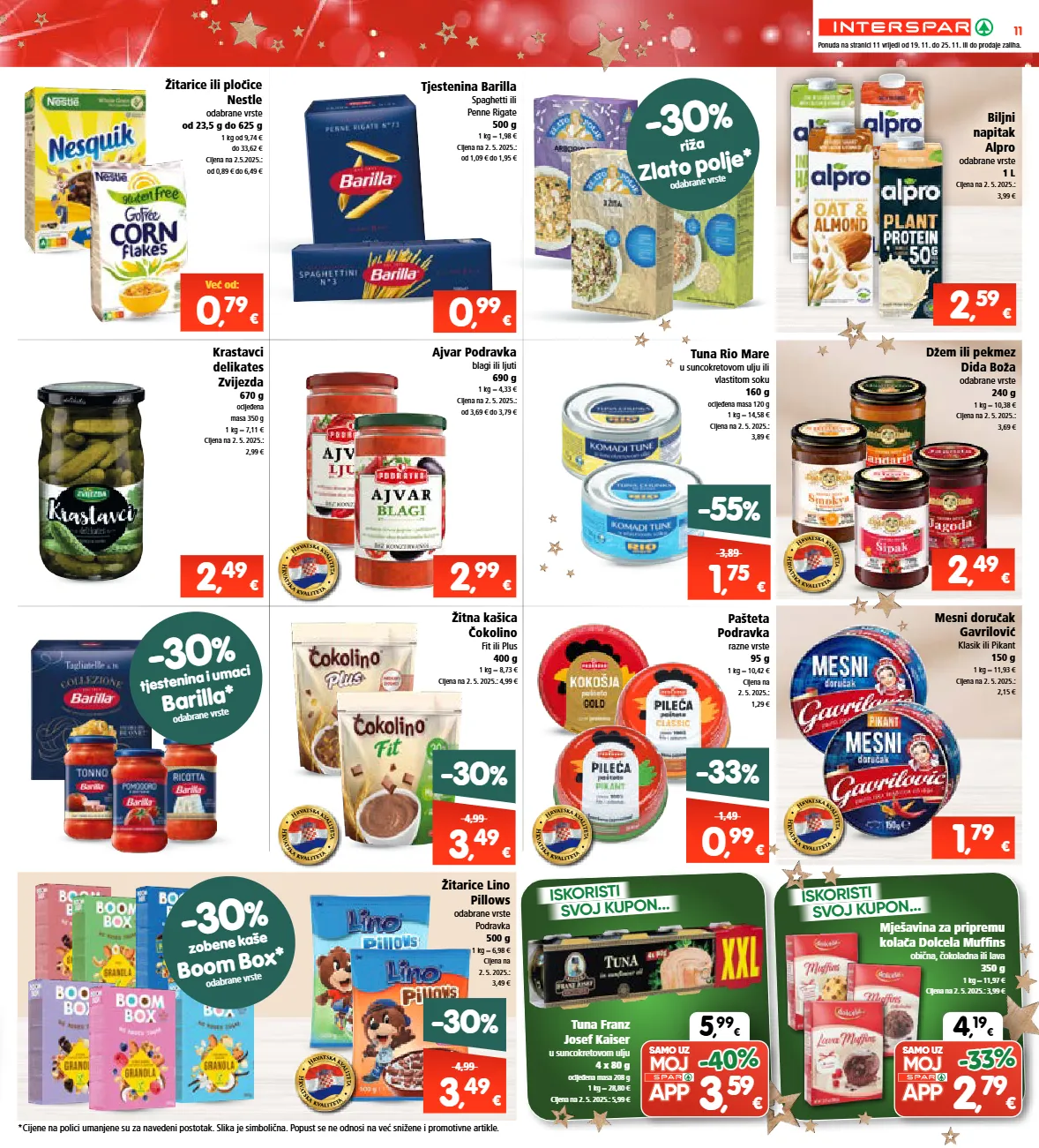 iskoristi svoj kupon... iskoristi svoj kupon... 5 , 99 € samo uz 3 , 59 € -40% -40% 4 , 19 € samo uz 2 , 79 € -33% -33% žitna kašica čokolino fit ili plus 400 g 1 kg = 8,73 € cijena na 2. 5. 2025.: 4,99 € -30 % zobene kaše boom box* odabrane vrste -30 % tjestenina i umaci barilla* odabrane vrste 3 , 49 € 4,99 -30 % 2 , 49 € 1 , 79 € 2 , 99 € 2 , 49 € 0 , 99 € mješavina za pripremu kolača dolcela muffins obična, čokoladna ili lava 350 g 1 kg = 11,97 € cijena na 2. 5. 2025.: 3,99 € tuna franz josef kaiser u suncokretovom ulju 4 x 80 g ocijeđena masa 208 g 1 kg = 28,80 € cijena na 2. 5. 2025.: 5,99 € džem ili pekmez dida boža odabrane vrste 240 g 1 kg = 10,38 € cijena na 2. 5. 2025.: 3,69 € krastavci delikates zvijezda 670 g ocijeđena masa 350 g 1 kg = 7,11 € cijena na 2. 5. 2025.: 2,99 € mesni doručak gavrilović klasik ili pikant 150 g 1 kg = 11,93 € cijena na 2. 5. 2025.: 2,15 € 0 , 79 € već od: 11 *cijene na polici umanjene su za navedeni postotak. slika je simboližna. popust se ne odnosi na več sničene i promotivne artikle. ponuda na stranici 11 vrijedi od 19. 11. do 25. 11. ili do prodaje zaliha. žitarice lino pillows odabrane vrste podravka 500 g 1 kg = 6,98 € cijena na 2. 5. 2025.: 3,49 € 3 , 49 € 4,99 -30 % 1 , 75 € 3,89 -55 % 0 , 99 € 1,49 -33 % tjestenina barilla spaghetti ili penne rigate 500 g 1 kg = 1,98 € cijena na 2. 5. 2025.: od 1,09 € do 1,95 € žitarice ili pločice nestle odabrane vrste od 23,5 g do 625 g 1 kg od 9,74 € do 33,62 € cijena na 2.5.2025.: od 0,89 € do 6,49 € pašteta podravka razne vrste 95 g 1 kg = 10,42 € cijena na 2. 5. 2025.: 1,29 € ajvar podravka blagi ili ljuti 690 g 1 kg = 4,33 € cijena na 2. 5. 2025.: od 3,69 € do 3,79 € tuna rio mare u suncokretovom ulju ili vlastitom soku 160 g ocijeđena masa 120 g 1 kg = 14,58 € cijena na 2. 5. 2025.: 3,89 € biljni napitak alpro odabrane vrste 1 l cijena na 2. 5. 2025.: 3,99 € -30 % riža zlato polje* odabrane vrste h r v a t s k a k v a l i t e t a h r v a t s k a k v a l i t e t a h r v a t s k a k v a l i t e t a h r v a t s k a k v a l i t e t a h r v a t s k a k v a l i t e t a h r v a t s k a k v a l i t e t a h r v a t s k a k v a l i t e t a h r v a t s k a k v a l i t e t a h r v a t s k a k v a l i t e t a h r v a t s k a k v a l i t e t a h r v a t s k a k v a l i t e t a h r v a t s k a k v a l i t e t a 2 , 59 €