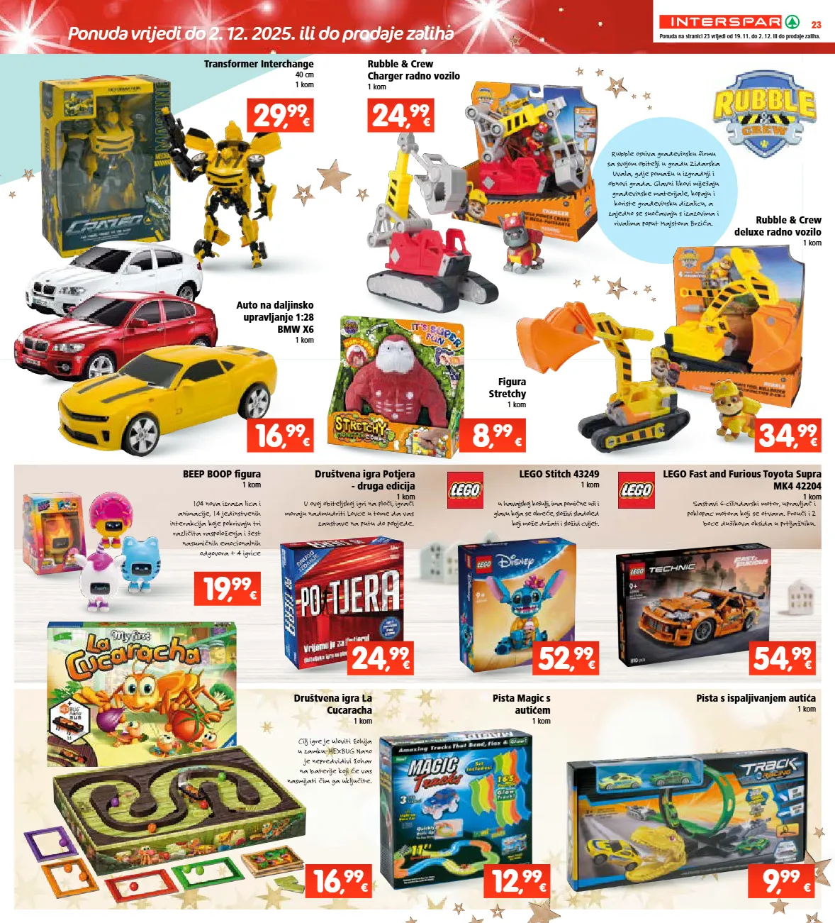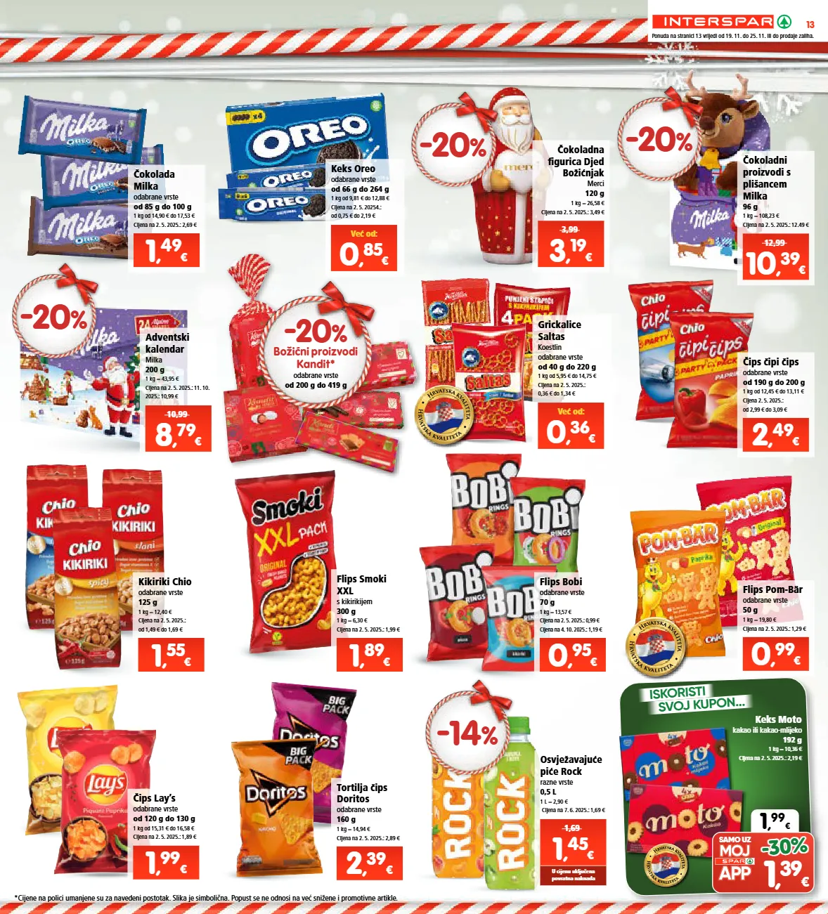-20 % božićni proizvodi kandit* odabrane vrste od 200 g do 419 g h r v a t s k a k v a l i t e t a h r v a t s k a k v a l i t e t a h r v a t s k a k v a l i t e t a h r v a t s k a k v a l i t e t a -14 % -20 % -20 % -20 % čokolada milka odabrane vrste od 85 g do 100 g 1 kg od 14,90 € do 17,53 € cijena na 2. 5. 2025.: 2,69 € 1 , 49 € čokoladna figurica djed božićnjak merci 120 g 1 kg = 26,58 € cijena na 2. 5. 2025.: 3,49 € 3 , 19 € 3,99 čokoladni proizvodi s plišancem milka 96 g 1 kg = 108,23 € cijena na 2. 5. 2025.: 12.49 € 10 , 39 € 12,99 adventski kalendar milka 200 g 1 kg = 43,95 € cijena na 2. 5. 2025.: 11. 10. 2025.: 10,99 € 8 , 79 € 10,99 tortilja čips doritos odabrane vrste 160 g 1 kg = 14,94 € cijena na 2. 5. 2025.: 2,89 € 2 , 39 € flips pom-bär odabrane vrste 50 g 1 kg = 19,80 € cijena na 2. 5. 2025.: 1,29 € 0 , 99 € čips čipi čips odabrane vrste od 190 g do 200 g 1 kg od 12,45 € do 13,11 € cijena 2. 5. 2025.: od 2,99 € do 3,09 € 2 , 49 € osvježavajuće piće rock razne vrste 0,5 l 1 l = 2,90 € cijena na 7. 6. 2025.: 1,69 € 1 , 45 € 1,69 u cijenu uključena povratna naknada h r v a t s k a k v a l i t e t a h r v a t s k a k v a l i t e t a iskoristi svoj kupon... 1 , 99 € samo uz 1 , 39 € -30% -30% keks moto kakao ili kakao-mlijeko 192 g 1 kg = 10,36 € cijena na 2. 5. 2025.: 2,19 € čips lay’s odabrane vrste od 120 g do 130 g 1 kg od 15,31 € do 16,58 € cijena na 2. 5. 2025.: 1,89 € 1 , 99 € flips smoki xxl s kikirikijem 300 g 1 kg = 6,30 € cijena na 2. 5. 2025.: 1,99 € 1 , 89 € kikiriki chio odabrane vrste 125 g 1 kg = 12,40 € cijena na 2. 5. 2025.: od 1,49 € do 1,69 € 1 , 55 € flips bobi odabrane vrste 70 g 1 kg = 13,57 € cijena na 2. 5. 2025.: 0,99 € cijena na 4. 10. 2025.: 1,19 € 0 , 95 € grickalice saltas koestlin odabrane vrste od 40 g do 220 g 1 kg od 5,95 € do 14,75 € cijena na 2. 5. 2025.: 0,36 € do 1,34 € 0 , 36 € već od: keks oreo odabrane vrste od 66 g do 264 g 1 kg od 9,81 € do 12,88 € cijena na 2. 5. 20254.: od 0,75 € do 2,19 € 0 , 85 € već od: 13 *cijene na polici umanjene su za navedeni postotak. slika je simboližna. popust se ne odnosi na več sničene i promotivne artikle. ponuda na stranici 13 vrijedi od 19. 11. do 25. 11. ili do prodaje zaliha.