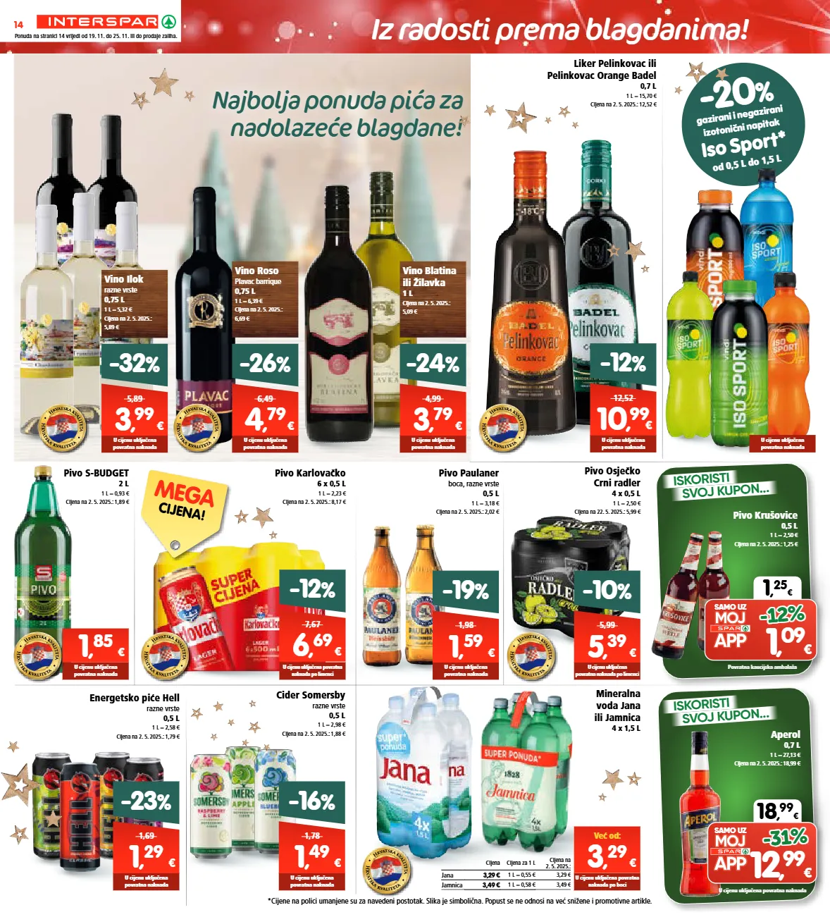 najbolja ponuda pića za nadolazeće blagdane! -20 % gazirani i negazirani izotonični napitak iso sport* od 0,5 l do 1,5 l *cijene na polici umanjene su za navedeni postotak. slika je simbolična. popust se ne odnosi na već snižene i promotivne artikle. energetsko piće hell razne vrste 0,5 l 1 l = 2,58 € cijena na 2. 5. 2025.: 1,79 € liker pelinkovac ili pelinkovac orange badel 0,7 l 1 l = 15,70 € cijena na 2. 5. 2025.: 12,52 € pivo osječko crni radler 4 x 0,5 l 1 l = 2,50 € cijena na 22. 5. 2025.: 5,99 € cider somersby razne vrste 0,5 l 1 l = 2,98 € cijena na 2. 5. 2025.: 1,88 € pivo paulaner boca, razne vrste 0,5 l 1 l = 3,18 € cijena na 2. 5. 2025.: 2,02 € pivo s-budget 2 l 1 l = 0,93 € cijena na 2. 5. 2025.: 1,89 € u cijenu uključena povratna naknada u cijenu uključena povratna naknada u cijenu uključena povratna naknada u cijenu uključena povratna naknada po limenci u cijenu uključena povratna naknada povratna kaucijska ambalaža u cijenu uključena povratna naknada pivo karlovačko 6 x 0,5 l 1 l = 2,23 € cijena na 2. 5. 2025.: 8,17 € u cijenu uključena povratna naknada po boci mineralna voda jana ili jamnica 4 x 1,5 l h r v a t s k a k v a l i t e t a h r v a t s k a k v a l i t e t a h r v a t s k a k v a l i t e t a h r v a t s k a k v a l i t e t a h r v a t s k a k v a l i t e t a h r v a t s k a k v a l i t e t a h r v a t s k a k v a l i t e t a h r v a t s k a k v a l i t e t a h r v a t s k a k v a l i t e t a h r v a t s k a k v a l i t e t a h r v a t s k a k v a l i t e t a h r v a t s k a k v a l i t e t a h r v a t s k a k v a l i t e t a h r v a t s k a k v a l i t e t a 1 , 85 € mega cijena! ponuda na stranici 14 vrijedi od 19. 11. do 25. 11. ili do prodaje zaliha. 14 iskoristi svoj kupon... iskoristi svoj kupon... pivo krušovice 0,5 l 1 l = 2,50 € cijena na 2. 5. 2025.: 1,25 € aperol 0,7 l 1 l = 27,13 € cijena na 2. 5. 2025.: 18,99 € u cijenu uključena povratna naknada 1 , 25 € samo uz 1 , 09 € -12% -12% u cijenu uključena povratna naknada 18 , 99 € samo uz 12 , 99 € -31% -31% cijena cijena za 1 l cijena na 2. 5. 2025.: jana 3,29 € 1 l = 0,55 € 3,29 € jamnica 3,49 € 1 l = 0,58 € 3,49 € 3 , 29 € već od: u cijenu uključena povratna naknada 1 , 29 € 1,69 -23 % 10 , 99 € 12,52 -12 % 5 , 39 € 5,99 -10 % u cijenu uključena povratna naknada po limenci 6 , 69 € 7,67 -12 % u cijenu uključena povratna naknada 1 , 49 € 1,78 -16 % 1 , 59 € 1,98 -19 % vino ilok razne vrste 0,75 l 1 l = 5,32 € cijena na 2. 5. 2025.: 5,89 € u cijenu uključena povratna naknada 3 , 99 € 5,89 -32 % vino blatina ili žilavka 1 l cijena na 2. 5. 2025.: 5,09 € u cijenu uključena povratna naknada 3 , 79 € 4,99 -24 % vino roso plavac barrique 0,75 l 1 l = 6,39 € cijena na 2. 5. 2025.: 6,69 € u cijenu uključena povratna naknada 4 , 79 € 6,49 -26 % iz radosti prema blagdanima!