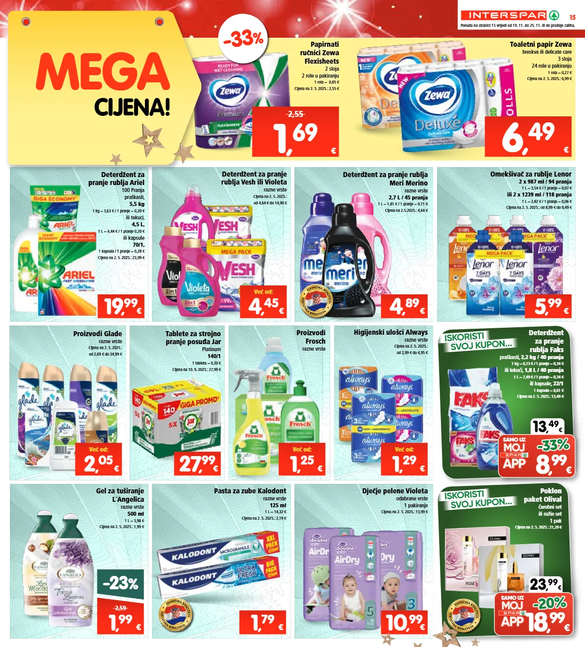 u cijenu uključena povratna naknada u cijenu uključena povratna naknada pasta za zube kalodont razne vrste 125 ml 1 l = 14,32 € cijena na 2. 5. 2025.: 2,19 € deterdžent za pranje rublja ariel 100 pranja praškasti, 5,5 kg 1 kg = 3,63 € / 1 pranje = 0,20 € ili tekuci, 4,5 l, 1 l = 4,44 € / 1 pranje 0,20 € ili kapsule 70/1, 1 kapsula / 1 pranje = 0,28 € cijena na 2. 5. 2025.: 23,99 € higijenski ulošci always razne vrste cijena na 2. 5. 2025.: od 2,99 € do 4,95 € deterdžent za pranje rublja vesh ili violeta razne vrste cijena na 2. 5. 2025.: od 4,64 € do 14,90 € proizvodi frosch razne vrste deterdžent za pranje rublja meri merino razne vrste 2,7 l / 45 pranja 1 l = 1,81 € / 1 pranje = 0,11 € cijena na 2.5.2025.: 4,64 € toaletni papir zewa breskva ili delicate care 3 sloja 24 role u pakiranju 1 rola = 0,27 € cijena na 2. 5. 2025.: 6,99 € tablete za strojno pranje posuđa jar platinum 140/1 1 tableta = 0,20 € cijena na 10. 9. 2025.: 27,99 € omekšivač za rublje lenor 2 x 987 ml / 94 pranja 1 l = 3,54 € / 1 pranje = 0,07 € ili 2 x 1239 ml / 118 pranja 1 l = 2,82 € / 1 pranje = 0,06 € cijena na 2. 5. 2025.: od 8,99 € do 9,49 € gel za tuširanje l´angelica razne vrste 500 ml 1 l = 3,98 € cijena na 2. 5. 2025.: 1,99 € dječje pelene violeta odabrane vrste 1 pakiranje cijena na 2. 5. 2025.: 13,99 € h r v a t s k a k v a l i t e t a h r v a t s k a k v a l i t e t a h r v a t s k a k v a l i t e t a h r v a t s k a k v a l i t e t a 19 , 99 € 27 , 99 € 5 , 99 € 4 , 89 € 1 , 79 € 10 , 99 € proizvodi glade razne vrste cijena na 2. 5. 2025.: od 2,69 € do 34,99 € ponuda na stranici 15 vrijedi od 19. 11. do 25. 11. ili do prodaje zaliha. 15 papirnati ručnici zewa flexisheets 2 sloja 2 role u pakiranju 1 rola = 0,85 € cijena na 2. 5. 2025.: 2,55 € iskoristi svoj kupon... iskoristi svoj kupon... poklon paket olival čarobni set ili ružin set 1 pak cijena na 2. 5. 2025.: 21,29 € deterdžent za pranje rublja faks praškasti, 2,2 kg / 40 pranja 1 kg = 6,13 € / 1 pranje = 0,34 € ili tekući, 1,8 l / 40 pranja 1 l = 7,49 € / 1 pranje = 0,34 € ili kapsule, 22/1 1 kapsula = 0,61 € cijena na 2. 5. 2025.: 13,49 € 23 , 99 € samo uz 18 , 99 € -20% -20% 13 , 49 € samo uz 8 , 99 € -33% -33% -33 % 4 , 45 € već od: 1 , 25 € već od: 1 , 29 € već od: 2 , 05 € već od: 1 , 99 € 2,59 -23 % 1 , 69 € 2,55 mega cijena! 6 , 49 € h r v a t s k a k v a l i t e t a h r v a t s k a k v a l i t e t a