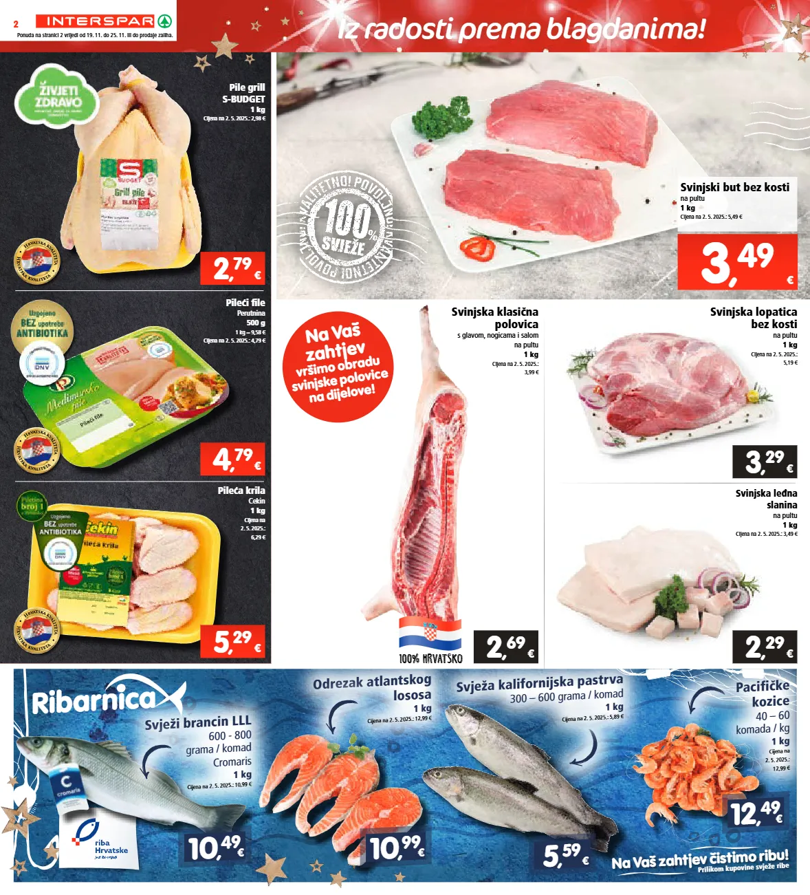 odrezak atlantskog lososa 1 kg cijena na 2. 5. 2025.: 12,99 € 100% hrvatsko pileća krila cekin 1 kg cijena na 2. 5. 2025.: 6,29 € 2 , 79 € svinjska klasična polovica s glavom, nogicama i salom na pultu 1 kg cijena na 2. 5. 2025.: 3,99 € 3 , 29 € na vaš zahtjev čistimo ribu! prilikom kupovine svježe ribe ribarnica svinjski but bez kosti na pultu 1 kg cijena na 2. 5. 2025.: 5,49 € svinjska lopatica bez kosti na pultu 1 kg cijena na 2. 5. 2025.: 5,19 € svinjska leđna slanina na pultu 1 kg cijena na 2. 5. 2025.: 3,49 € pileći file perutnina 500 g 1 kg = 9,58 € cijena na 2. 5. 2025.: 4,79 € 4 , 79 € pile grill s-budget 1 kg cijena na 2. 5. 2025.: 2,98 € 10 , 49 € svježi brancin lll 600 - 800 grama / komad cromaris 1 kg cijena na 2. 5. 2025.: 10,99 € 12 , 49 € pacifičke kozice 40 – 60 komada / kg 1 kg cijena na 2. 5. 2025.: 12,99 € svježa kalifornijska pastrva 300 – 600 grama / komad 1 kg cijena na 2. 5. 2025.: 5,89 € 10 , 99 € 5 , 59 € 5 , 29 € 2 , 69 € 2 , 29 € 3 , 49 € na vaš zahtjev vršimo obradu svinjske polovice na dijelove! h r v a t s k a k v a l i t e t a h r v a t s k a k v a l i t e t a h r v a t s k a k v a l i t e t a h r v a t s k a k v a l i t e t a h r v a t s k a k v a l i t e t a h r v a t s k a k v a l i t e t a ponuda na stranici 2 vrijedi od 19. 11. do 25. 11. ili do prodaje zaliha. 2 iz radosti prema blagdanima!