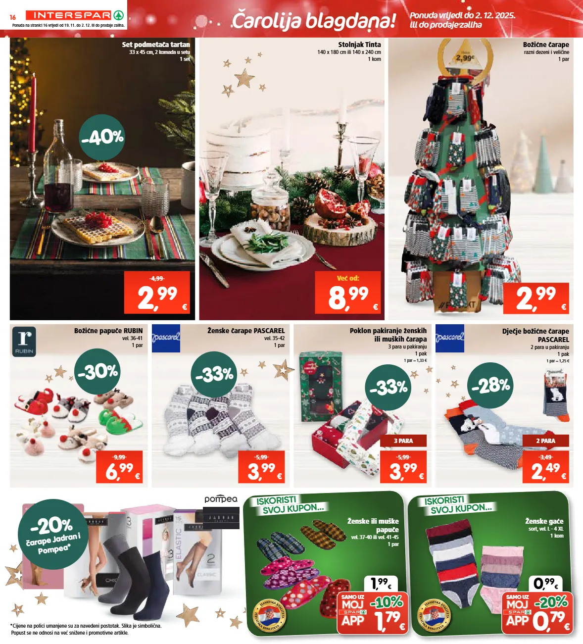h r v a t s k a k v a l i t e t a h r v a t s k a k v a l i t e t a iskoristi svoj kupon... iskoristi svoj kupon... ženske gaće sort, vel. l - 4 xl 1 kom ženske ili muške papuče vel. 37-40 ili vel. 41-45 1 par -28 % -40 % -33 % -30 % -33 % 1 , 99 € samo uz 1 , 79 € -10% -10% h r v a t s k a k v a l i t e t a h r v a t s k a k v a l i t e t a 0 , 99 € samo uz 0 , 79 € -20% -20% 6 , 99 € 9,99 2 , 49 € 3,49 3 , 99 € 5,99 3 , 99 € 5,99 -20 % čarape jadran i pompea* božićne čarape razni dezeni i veličine 1 par 3 para 2 para ponuda na stranici 16 vrijedi od x. x. do x. x. ili do prodaje zaliha. ponuda na stranici 16 vrijedi od 19. 11. do 2. 12. ili do prodaje zaliha. 16 božićne papuče rubin vel. 36-41 1 par set podmetača tartan 33 x 45 cm, 2 komada u setu 1 set stolnjak tinta 140 x 180 cm ili 140 x 240 cm 1 kom dječje božićne čarape pascarel 2 para u pakiranju 1 pak 1 par = 1,25 € ženske čarape pascarel vel. 35-42 1 par poklon pakiranje ženskih ili muških čarapa 3 para u pakiranju 1 pak 1 par = 1,33 € *cijene na polici umanjene su za navedeni postotak. slika je simbolična. popust se ne odnosi na već snižene i promotivne artikle. čarolija blagdana! ponuda vrijedi do 2. 12. 2025. ili do prodaje zaliha 2 , 99 € 2 , 99 € 4,99 8 , 99 € već od: