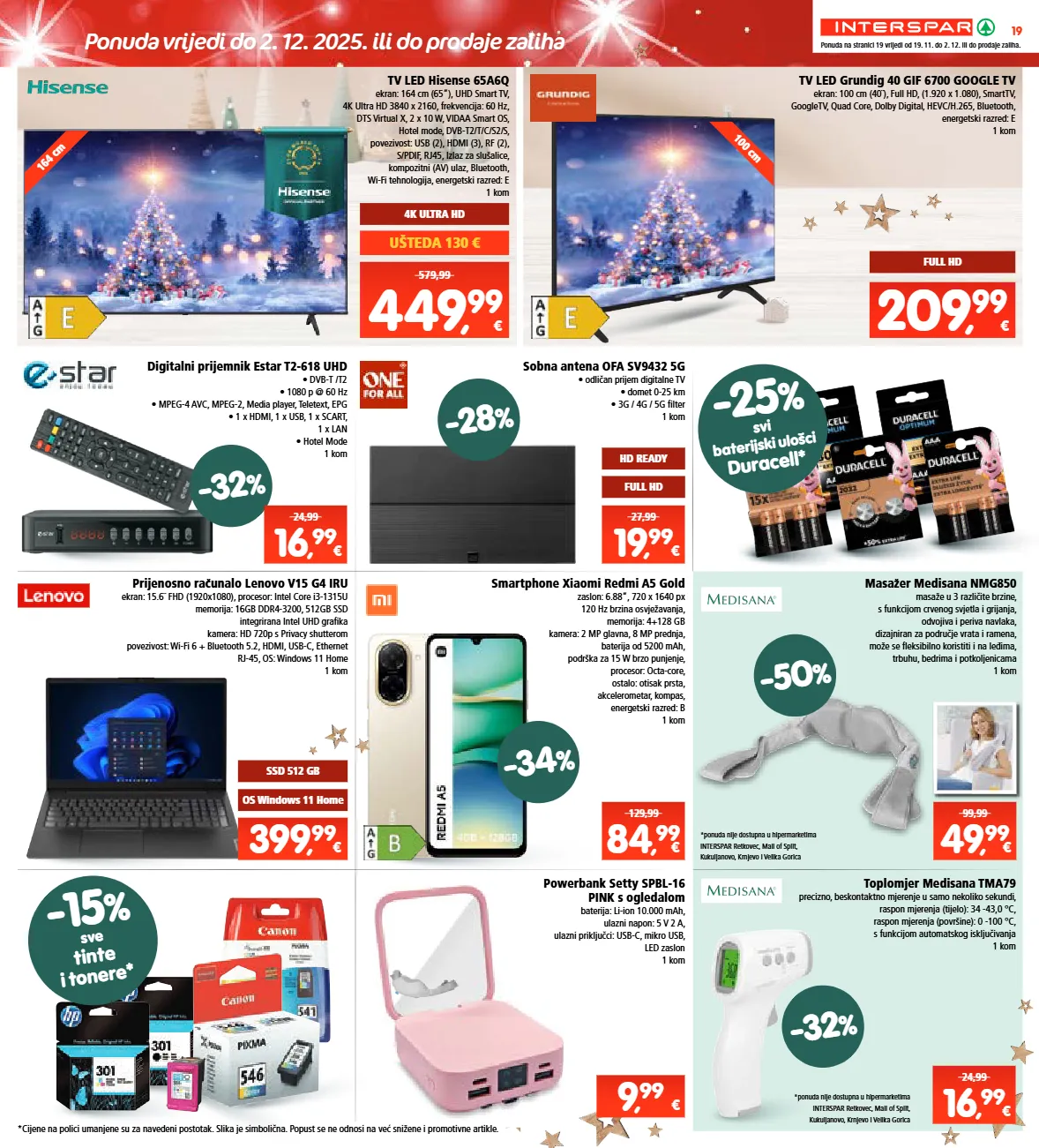 powerbank setty spbl-16 pink s ogledalom baterija: li-ion 10.000 mah, ulazni napon: 5 v 2 a, ulazni priključci: usb-c, mikro usb, led zaslon 1 kom prijenosno računalo lenovo v15 g4 iru ekran: 15.6¨ fhd (1920x1080), procesor: intel core i3-1315u memorija: 16gb ddr4-3200, 512gb ssd integrirana intel uhd grafika kamera: hd 720p s privacy shutterom povezivost: wi-fi 6 + bluetooth 5.2, hdmi, usb-c, ethernet rj-45, os: windows 11 home 1 kom -32 % -32 % -50 % -34 % -28 % digitalni prijemnik estar t2-618 uhd • dvb-t /t2 • 1080 p @ 60 hz • mpeg-4 avc, mpeg-2, media player, teletext, epg • 1 x hdmi, 1 x usb, 1 x scart, 1 x lan • hotel mode 1 kom toplomjer medisana tma79 precizno, beskontaktno mjerenje u samo nekoliko sekundi, raspon mjerenja (tijelo): 34 -43,0 °c, raspon mjerenja (površine): 0 -100 °c, s funkcijom automatskog isključivanja 1 kom masažer medisana nmg850 masaže u 3 različite brzine, s funkcijom crvenog svjetla i grijanja, odvojiva i periva navlaka, dizajniran za područje vrata i ramena, može se fleksibilno koristiti i na leđima, trbuhu, bedrima i potkoljenicama 1 kom smartphone xiaomi redmi a5 gold zaslon: 6.88”, 720 x 1640 px 120 hz brzina osvježavanja, memorija: 4+128 gb kamera: 2 mp glavna, 8 mp prednja, baterija od 5200 mah, podrška za 15 w brzo punjenje, procesor: octa-core, ostalo: otisak prsta, akcelerometar, kompas, energetski razred: b 1 kom sobna antena ofa sv9432 5g • odličan prijem digitalne tv • domet 0-25 km • 3g / 4g / 5g filter 1 kom tv led hisense 65a6q ekran: 164 cm (65”), uhd smart tv, 4k ultra hd 3840 x 2160, frekvencija: 60 hz, dts virtual x, 2 x 10 w, vidaa smart os, hotel mode, dvb-t2/t/c/s2/s, povezivost: usb (2), hdmi (3), rf (2), s/pdif, rj45, izlaz za slušalice, kompozitni (av) ulaz, bluetooth, wi-fi tehnologija, energetski razred: e 1 kom 164 cm os windows 11 home ssd 512 gb 399 , 99 € 9 , 99 € -15 % sve tinte i tonere* -25 % svi baterijski ulošci duracell* tv led grundig 40 gif 6700 google tv ekran: 100 cm (40¨), full hd, (1.920 x 1.080), smarttv, googletv, quad core, dolby digital, hevc/h.265, bluetooth, energetski razred: e 1 kom 100 cm *ponuda nije dostupna u hipermarketima interspar retkovec, mall of split, kukuljanovo, krnjevo i velika gorica *ponuda nije dostupna u hipermarketima interspar retkovec, mall of split, kukuljanovo, krnjevo i velika gorica *cijene na polici umanjene su za navedeni postotak. slika je simbolična. popust se ne odnosi na već snižene i promotivne artikle. ponuda na stranici 19 vrijedi od x. x. do x. x. ili do prodaje zalih ponuda na stranici 19 vrijedi od 19. 11. do 2. 12. ili do prodaje zaliha. 19 ušteda 130 € 449 , 99 € 579,99 16 , 99 € 24,99 16 , 99 € 24,99 49 , 99 € 99,99 84 , 99 € 129,99 19 , 99 € 27,99 full hd full hd hd ready 4k ultra hd 209 , 99 € ponuda vrijedi do 2. 12. 2025. ili do prodaje zaliha