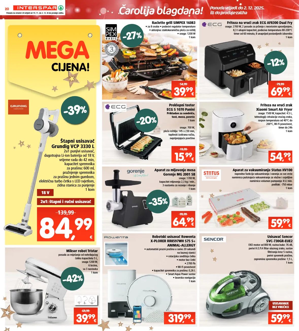 mega cijena! usisavač sencor svc-730gr-eue2 eko motor od 800 w, razina buke: 76 db, perivi h.e.p.a filtar ulaznog zraka, sustav filtriranja kroz 5 razina, perivi spremnik prašine, zapremina spremnika prašine: 1,5 l, 1 kom mikser robot tristar posuda za miješanje od nehrđajućeg čelika kapaciteta 5 l, snaga 1200 w, 6 brzina, sa 3 nastavka 1 kom aparat za mljevenje mesa gorenje mg 2001 sb snaga: 1700 w, kapacitet mljevenja 2,3 kg / min., 3 nastavka za rezanje i ribanje 1 kom friteza na vrući zrak xiaomi smart air fryer snaga: 1500 w, kapacitet: 4.5 l, tehnologiji cirkulacije vrućeg zraka, raspon temperatura od 40°c do 200°c, wi-fi povezivost, timer do 24h 1 kom friteza na vrući zrak ecg af8300 dual fry snaga: 2700 w, 2 posude za prženje s neovisnim upravljanjem, 8,3 l ukupni kapacitet, podesiva temperatura 80-200°c timer od 60 minuta, 8 unaprijed postavljenih izbornika 1 kom raclette grill simpex 16083 • za 8 osoba • podesivi regulator temperature • uklonjiva staklokeramička ploča za roštilj • snaga: 1200 w 1 kom aparat za vakuumiranje status hv100 napredne funkcije vakuumiranja i varenja za sve vrste namirnica pulsirajuće vakuumiranje za vlažne i osjetljive namirnice volumen pumpanja: 8 l/ min. podtlak: -750 mbar 1 kom -27 % -20 % -12 % -35 % -39 % štapni usisavač grundig vcp 3330 l 2u1 punjivi usisavač, dugotrajna li-ion baterija od 18 v, vrijeme rada do 42 min, kapacitet spremnika za prašinu: 600 ml, pražnjenje spremnika za prašinu jednim gumbom, električna turbo četka s led svjetlom, zidna stanica za punjenje 1 kom robotski usisavač rowenta x-plorer rr8597wh s75 s+ animal-allergy • automatski prazni prašinu u samo 20 sekundi na baznoj stanici • rotacijska središnja četka • motor bez četki • 2700 pa • wi-fi povezivost • kapacitet spremnika za prašinu: 0,26 l • smart aqua power sustav • laserska navigacija 1 kom usisavanje bez vrećice snaga: 700 w, ploče roštilja: 145 x 230 mm, toplinski izolirana ručka, neprijanjajuće površine preklopni toster ecg s 1070 panini prikladan za sendviče, tost, meso, povrće 1 kom 59 , 99 € 54 , 99 € 319 , 99 € 59 , 99 € 2u1: štapni i ručni usisavač 18 v ponuda na stranici 20 vrijedi od x. x. do x. x. ili do prodaje zaliha. ponuda na stranici 20 vrijedi od 19. 11. do 2. 12. ili do prodaje zaliha. 20 39 , 99 € 54,99 15 , 99 € 19,99 -42 % 39 , 99 € 69,99 64 , 99 € 99,99 69 , 99 € 79,99 84 , 99 € 139,99 čarolija blagdana! ponuda vrijedi do 2. 12. 2025. ili do prodaje zaliha