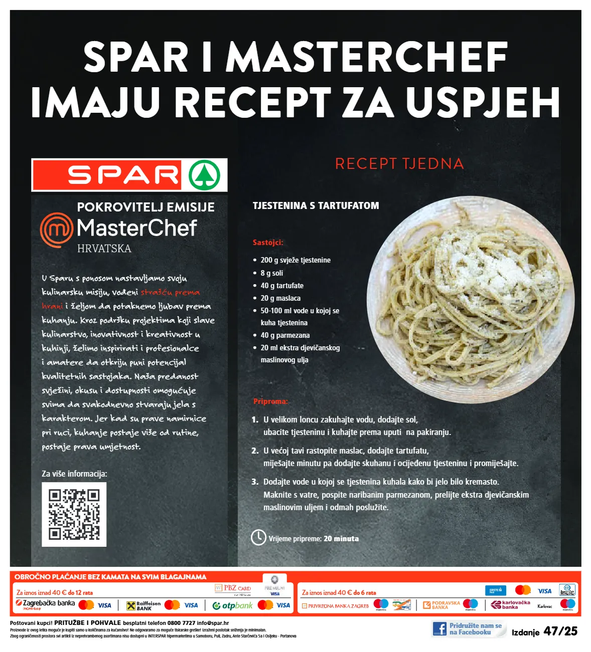 sastojci: • 200 g svježe tjestenine • 8 g soli • 40 g tartufate • 20 g maslaca • 50-100 ml vode u kojoj se kuha tjestenina • 40 g parmezana • 20 ml ekstra djevičanskog maslinovog ulja priprema: 1. u velikom loncu zakuhajte vodu, dodajte sol, ubacite tjesteninu i kuhajte prema uputi na pakiranju. 2. u većoj tavi rastopite maslac, dodajte tartufatu, miješajte minutu pa dodajte skuhanu i ocijeđenu tjesteninu i promiješajte. 3. dodajte vode u kojoj se tjestenina kuhala kako bi jelo bilo kremasto. maknite s vatre, pospite naribanim parmezanom, prelijte ekstra djevičanskim maslinovim uljem i odmah poslužite. tjestenina s tartufatom recept tjedna vrijeme pripreme: 20 minuta spar i masterchef imaju recept za uspjeh u sparu s ponosom nastavljamo svoju kulinarsku misiju, vođeni strašću prema hrani i željom da potaknemo ljubav prema kuhanju. kroz podršku projektima koji slave kulinarstvo, inovativnost i kreativnost u kuhinji, želimo inspirirati i profesionalce i amatere da otkriju puni potencijal kvalitetnih sastojaka. naša predanost svježini, okusu i dostupnosti omogućuje svima da svakodnevno stvaraju jela s karakterom. jer kad su prave namirnice pri ruci, kuhanje postaje više od rutine, postaje prava umjetnost. za više informacija: poπtovani kupci! prituæbe i pohvale besplatni telefon 0800 7727 info@spar.hr proizvode iz ovog letka moguće je kupiti samo u količinama za kućanstvo! ne odgovaramo za moguće tiskarske greške! izraženi postotak sniženja je minimalan. zbog ograničenosti prostora svi artikli iz neprehrambenog asortimana nisu dostupni u interspar hipermarketima u samoboru, puli, zadru, ante starčevića 5a i osijeku - portanova obročno plaćanje bez kamata na svim blagajnama karlovac debit electronic use only 4574 vrijedi do valid thru kontakt centar tel. + 385 1 4891 333 molimo nalaznika ove kartice da ju uruči najbližoj poslovnici banke. ova kartica je vlasništvo privredne banke zagreb d.d. this card is the property of privredna banka zagreb d.d., radnička cesta 50, 10000 zagreb, croatia, and must be returned upon request. potpis authorized signature - not valid unless signed za iznos iznad 40 € do 12 rata za iznos iznad 40 € do 6 rata pridružite nam se na facebooku izdanje 47/25 pokrovitelj emisije