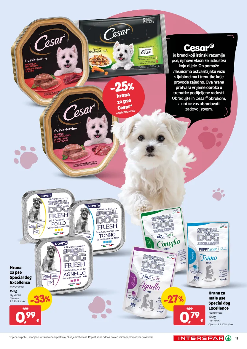 cesar ® je brend koji istinski razumije pse, njihove vlasnike i iskustva koja dijele. on pomaže vlasnicima ostvariti jaku vezu s ljubimcima i trenutke koje provode zajedno. ova hrana pretvara vrijeme obroka u trenutke podijeljene radosti. obradujte ih cesar ® obrokom, a oni će vas obradovati zadovoljstvom. je brend koji istinski razumije pse, njihove vlasnike i iskustva vlasnicima ostvariti jaku vezu s ljubimcima i trenutke koje trenutke podijeljene radosti. obradujte ih cesar a oni će vas obradovati zadovoljstvom. -25 % hrana za pse cesar* odabrane vrste hrana za pse special dog excellence razne vrste 150 g 1 kg = 6,60 € cijena na 2. 5. 2025.: 1,39 € -33 % 0 , 99 € 1,49 hrana za male pse special dog excellence razne vrste 100 g 1 kg = 7,90 € cijena na 2. 5. 2025.: 1,09 € -27 % 0 , 79 € 1,09 11 *cijene na polici umanjene su za navedeni postotak. slika je simbolična. popust se ne odnosi na već snižene i promotivne proizvode.