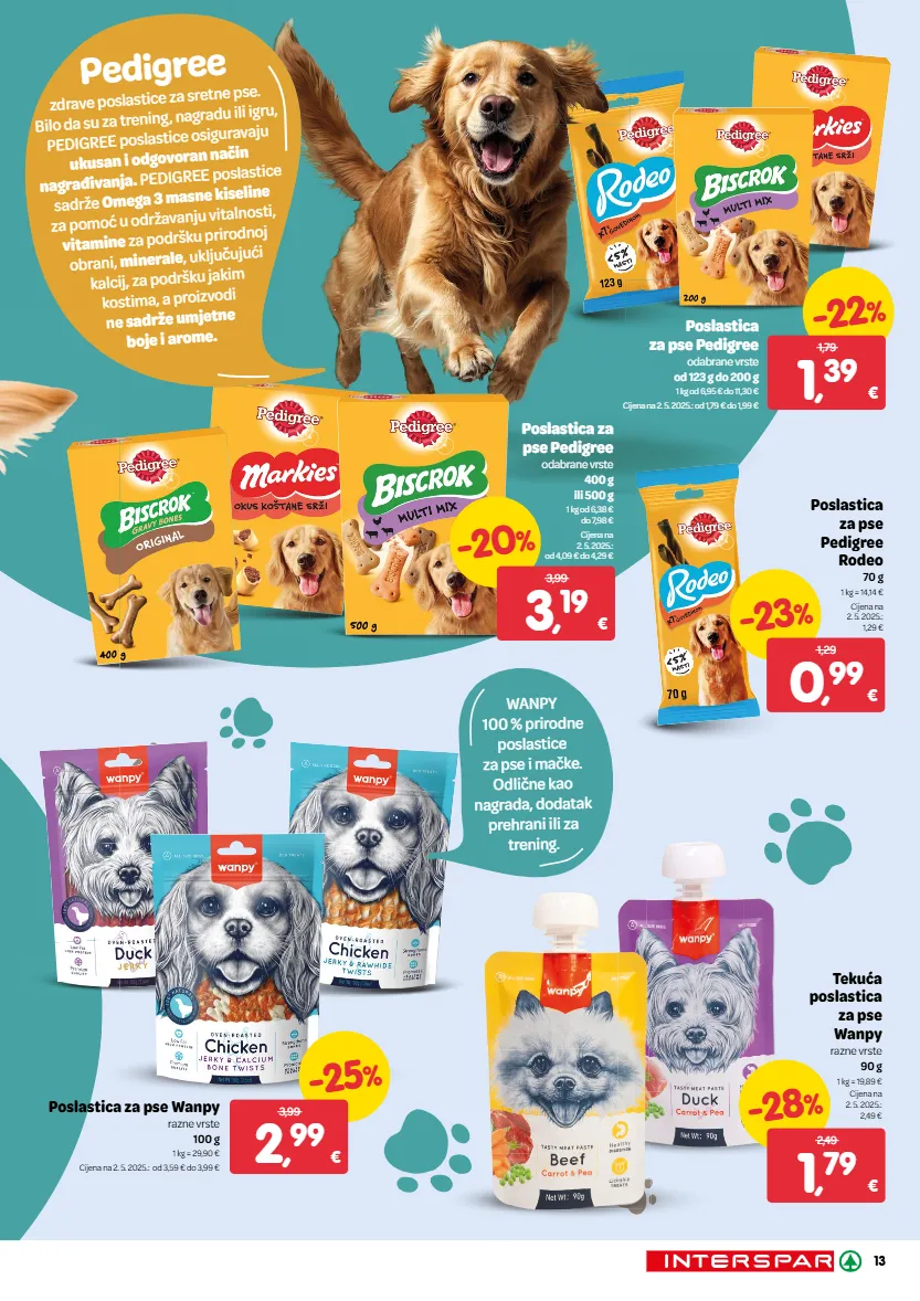Pedigree zdrave poslastice za sretne pse. Bilo da su za trening, nagradu ili igru, PEDIGREE poslastice osiguravaju ukusan i odgovoran način nagrađivanja. PEDIGREE poslastice sadrže Omega 3 masne kiseline za pomoć u održavanju vitalnosti, vitamine za podršku prirodnoj obrani, minerale , uključujući kalcij, za podršku jakim kostima, a proizvodi ne sadrže umjetne boje i arome. kostima, a proizvodi ne sadrže umjetne Poslastica za pse Pedigree odabrane vrste od 123 g do 200 g 1 kg od 6,95 € do 11,30 € Cijena na 2. 5. 2025.: od 1,79 € do 1,99 € -22 % 1 , 39 € 1,79 Poslastica za pse Pedigree odabrane vrste 400 g ili 500 g 1 kg od 6,38 € do 7,98 € Cijena na 2. 5. 2025.: od 4,09 € do 4,29 € -20 % 3 , 19 € 3,99 Poslastica za pse Pedigree Rodeo 70 g 1 kg = 14,14 € Cijena na 2. 5. 2025.: 1,29 € -23 % 0 , 99 € 1,29 Poslastica za pse Wanpy razne vrste 100 g 1 kg = 29,90 € Cijena na 2. 5. 2025.: od 3,59 € do 3,99 € WANPY 100 % prirodne poslastice za pse i mačke. Odlične kao nagrada, dodatak prehrani ili za trening. Tekuća poslastica za pse Wanpy razne vrste 90 g 1 kg = 19,89 € Cijena na 2. 5. 2025.: 2,49 € -28 % 1 , 79 € 2,49 -25 % 2 , 99 € 3,99 13