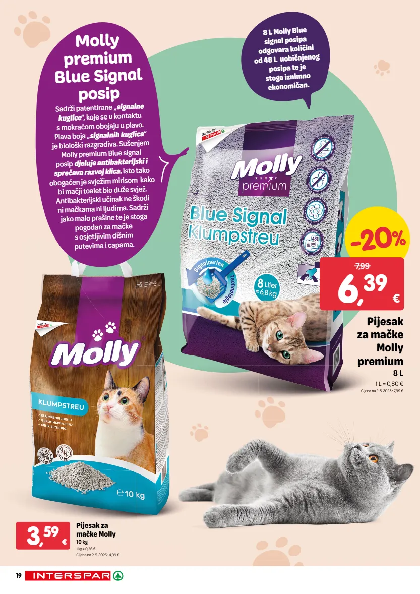 Pijesak za mačke Molly 10 kg 1 kg = 0,36 € Cijena na 2. 5. 2025.: 4,99 € -20 % Pijesak za mačke Molly premium 8 L 1 L = 0,80 € Cijena na 2. 5. 2025.: 7,99 € 6 , 39 € 7,99 Molly premium Blue Signal posip Sadrži patentirane „ signalne kuglice “, koje se u kontaktu s mokraćom obojaju u plavo. Plava boja „ signalnih kuglica “ je biološki razgradiva. Sušenjem Molly premium Blue signal posip djeluje antibakterijski i sprečava razvoj klica. Isto tako obogaćen je svježim mirisom kako bi mačji toalet bio duže svjež. Antibakterijski učinak ne škodi ni mačkama ni ljudima. Sadrži jako malo prašine te je stoga pogodan za mačke s osjetljivim dišnim putevima i capama. 8 L Molly Blue signal posipa odgovara količini od 48 L uobičajenog posipa te je stoga iznimno ekonomičan. premium premium 8 L 1 L = 0,80 € 1 L = 0,80 € Cijena na 2. 5. 2025.: 7,99 € 2. 5. 2025.: 7,99 € 3 , 59 € 19