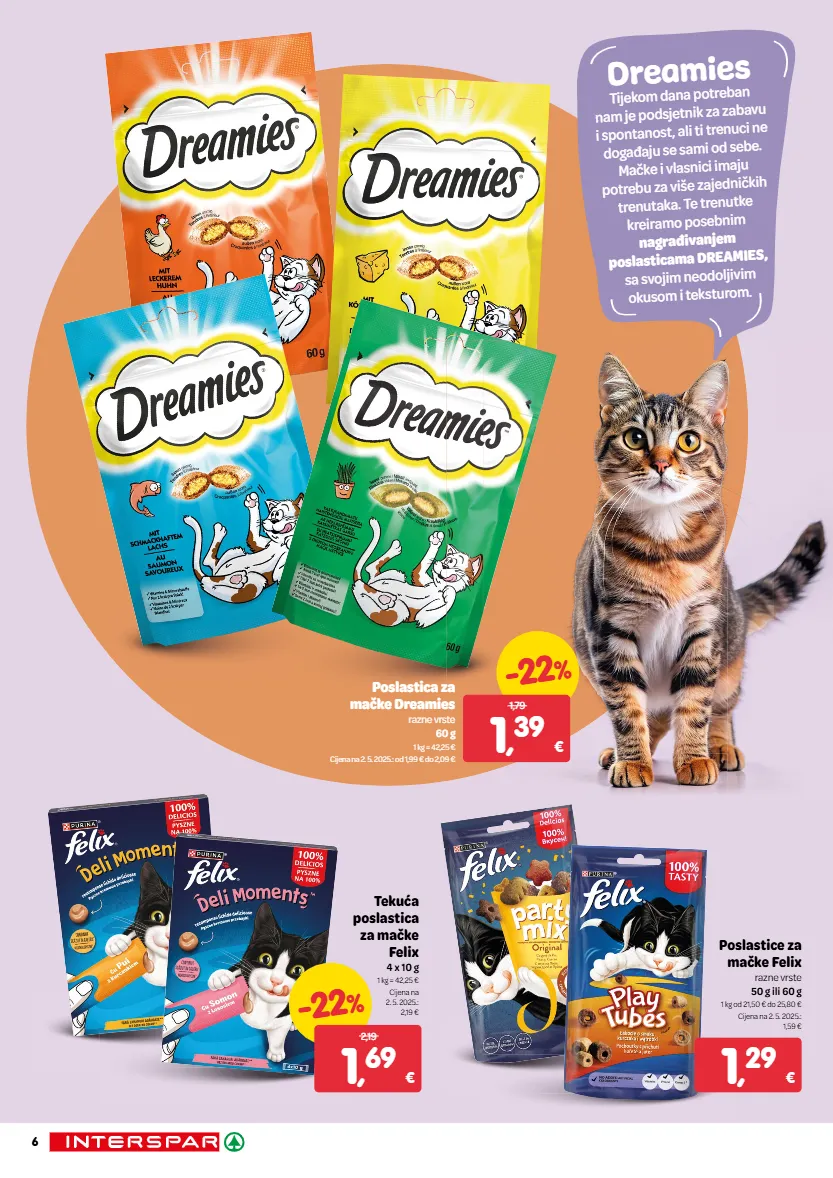 Dreamies Tijekom dana potreban nam je podsjetnik za zabavu i spontanost, ali ti trenuci ne događaju se sami od sebe. Mačke i vlasnici imaju potrebu za više zajedničkih trenutaka. Te trenutke kreiramo posebnim nagrađivanjem poslasticama DREAMIES, sa svojim neodoljivim okusom i teksturom. Poslastice za mačke Felix razne vrste 50 g ili 60 g 1 kg od 21,50 € do 25,80 € Cijena na 2. 5. 2025.: 1,59 € 1 , 29 € -22 % 1 , 69 € 2,19 Tekuća poslastica za mačke Felix 4 x 10 g 1 kg = 42,25 € Cijena na 2. 5. 2025.: 2,19 € -22 % 1 , 39 € 1,79 Poslastica za mačke Dreamies razne vrste 60 g 1 kg = 42,25 € Cijena na 2. 5. 2025.: od 1,99 € do 2,09 € 6