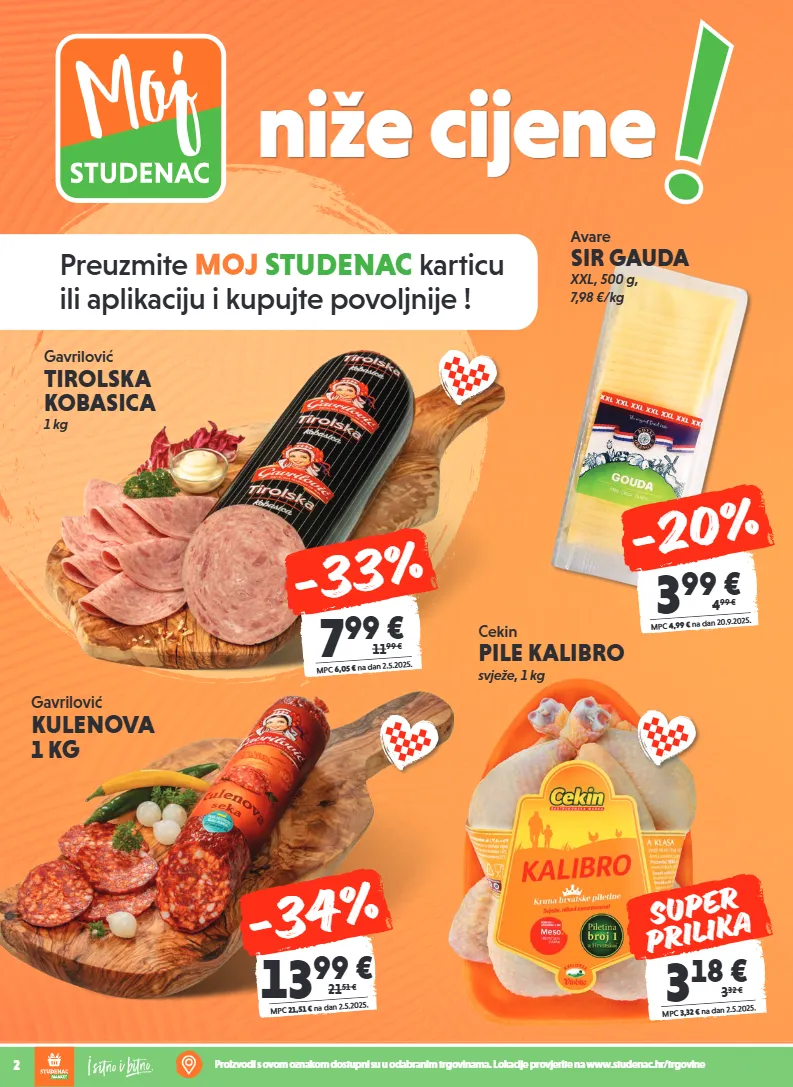 preuzmite moj studenac karticu ili aplikaciju i kupujte povoljnije ! 2 proizvodi s ovom oznakom dostupni su u odabranim trgovinama. lokacije provjerite na www.studenac.hr/trgovine niže cijene 3 99 € mpc 4,99 € na dan 20.9.2025. 4 99 € -20% avare sir gauda xxl, 500 g, 7,98 €/kg 7 99 € mpc 6,05 € na dan 2.5.2025. 11 99 € -33% gavrilović tirolska kobasica 1 kg 13 99 € mpc 21,51 € na dan 2.5.2025. 21 51 € -34% gavrilović kulenova 1 kg 3 18 € mpc 3,32 € na dan 2.5.2025. 3 32 € super prilika cekin pile kalibro svježe, 1 kg