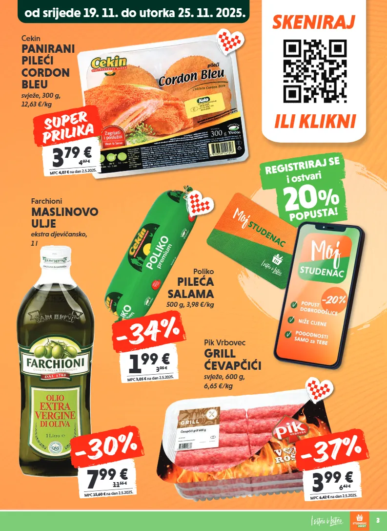 od srijede 19. 11. do utorka 25. 11. 2025. niže cijene svaki tjedan ostvari ekstra uštedu od 20 % na ukupni iznos kupovine! * detalje potraži na: www.studenac.hr/moj-studenac koestlin napolitanke voćne kocke, 370 g, 5,92 €/kg 2 19 € mpc 3,21 € na dan 2.5.2025. 3 05 € -28% pik vrbovec mortadela 1 kg 7 99 € mpc 11,21 € na dan 2.5.2025. 11,99 € -33%