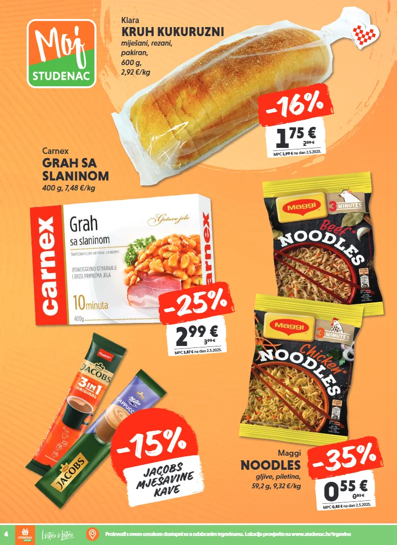 4 proizvodi s ovom oznakom dostupni su u odabranim trgovinama. lokacije provjerite na www.studenac.hr/trgovine 2 99 € mpc 3,87 € na dan 2.5.2025. 3 99 € -25% carnex grah sa slaninom 400 g, 7,48 €/kg maggi noodles gljive, piletina, 59,2 g, 9,32 €/kg 1 75 € mpc 1,99 € na dan 2.5.2025. 2 09 € -16% klara kruh kukuruzni miješani, rezani, pakiran, 600 g, 2,92 €/kg 0 55 € mpc 0,85 € na dan 2.5.2025. 0 85 € -35% -15% jacobs mješavine kave