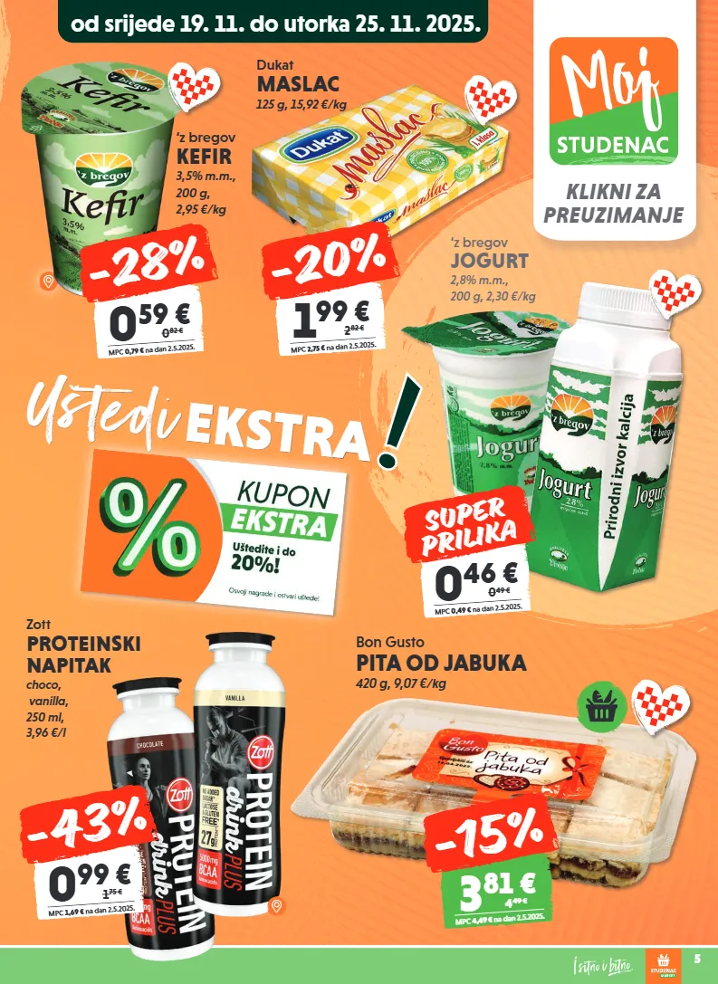 5 klikni za preuzimanje ‘z bregov jogurt 2,8% m.m., 200 g, 2,30 €/kg ‘z bregov kefir 3,5% m.m., 200 g, 2,95 €/kg bon gusto pita od jabuka 420 g, 9,07 €/kg od srijede 19. 11. do utorka 25. 11. 2025. dukat maslac 125 g, 15,92 €/kg 3 81 € mpc 4,49 € na dan 2.5.2025. -15% 4 49 € zott proteinski napitak choco, vanilla, 250 ml, 3,96 €/l uštedi ekstra 0 46 € mpc 0,49 € na dan 2.5.2025. 0 49 € super prilika 1 99 € mpc 2,75 € na dan 2.5.2025. 2 82 € -20% 0 59 € mpc 0,79 € na dan 2.5.2025. 0 82 € -28% 0 99 € mpc 1,69 € na dan 2.5.2025. 1 75 € -43%