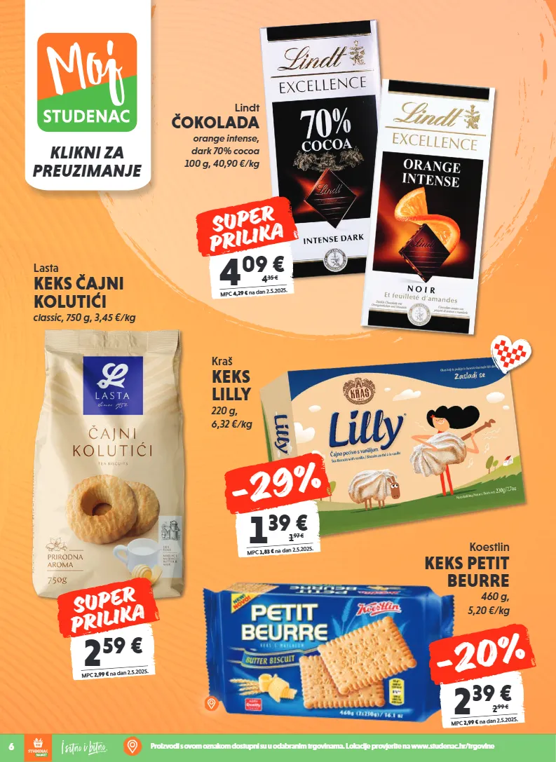 KLIKNI ZA PREUZIMANJE 6 Proizvodi s ovom oznakom dostupni su u odabranim trgovinama. Lokacije provjerite na www.studenac.hr/trgovine 1 39 € MPC 1,83 € na dan 2.5.2025. 1 97 € -29% Kraš KEKS LILLY 220 g, 6,32 €/kg 2 39 € MPC 2,99 € na dan 2.5.2025. 2 99 € -20% Koestlin KEKS PETIT BEURRE 460 g, 5,20 €/kg 2 59 € MPC 2,99 € na dan 2.5.2025. SUPER PRILIKA Lasta KEKS ČAJNI KOLUTIĆI classic, 750 g, 3,45 €/kg 4 09 € MPC 4,29 € na dan 2.5.2025. 4 35 € SUPER PRILIKA Lindt ČOKOLADA orange intense, dark 70% cocoa 100 g, 40,90 €/kg