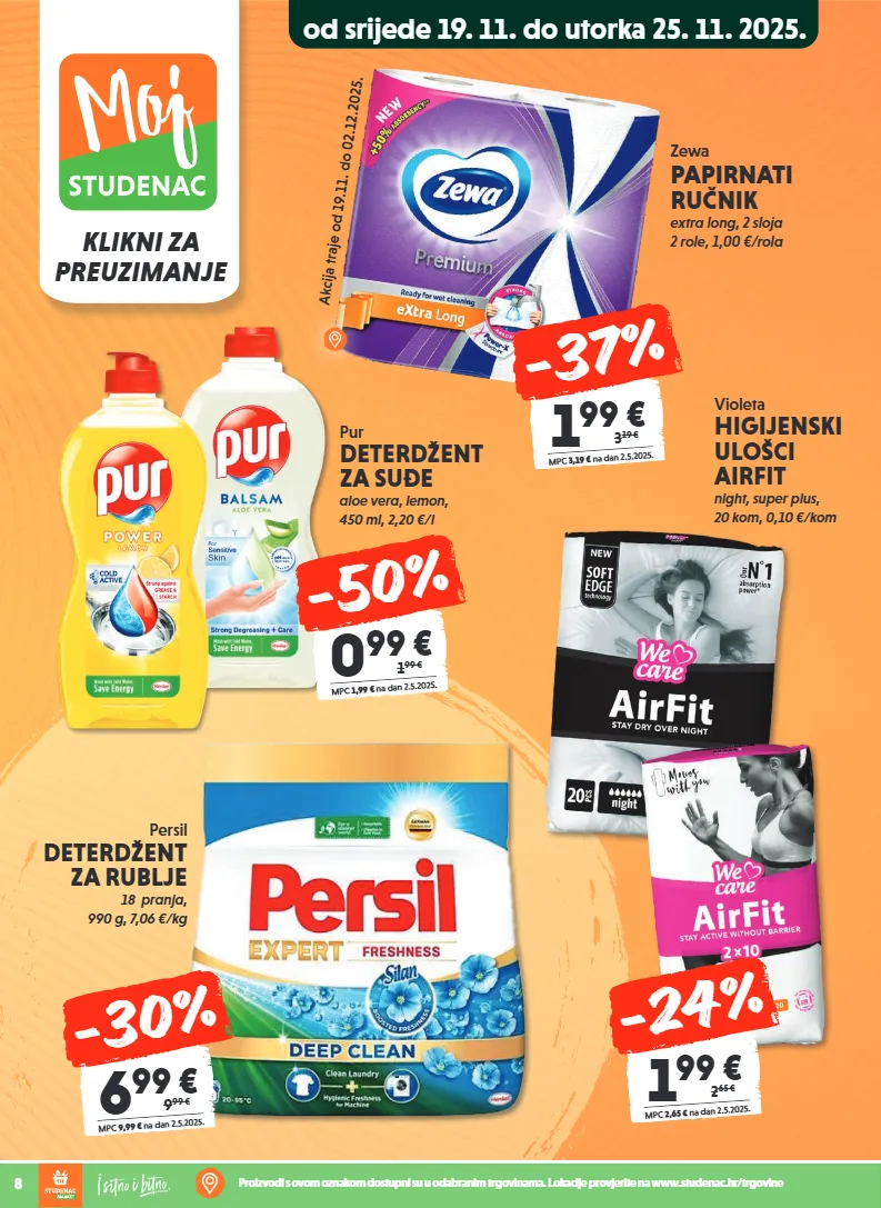 8 proizvodi s ovom oznakom dostupni su u odabranim trgovinama. lokacije provjerite na www.studenac.hr/trgovine klikni za preuzimanje od srijede 19. 11. do utorka 25. 11. 2025. 1 99 € mpc 3,19 € na dan 2.5.2025. 3 19 € -37% zewa papirnati ručnik extra long, 2 sloja 2 role, 1,00 €/rola akcija traje od 19.11. do 02.12.2025. violeta higijenski ulošci airfit night, super plus, 20 kom, 0,10 €/kom pur deterdžent za suđe aloe vera, lemon, 450 ml, 2,20 €/l persil deterdžent za rublje 18 pranja, 990 g, 7,06 €/kg 1 99 € mpc 2,65 € na dan 2.5.2025. 2 65 € -24% 6 99 € mpc 9,99 € na dan 2.5.2025. 9 99 € -30% 0 99 € mpc 1,99 € na dan 2.5.2025. 1 99 € -50%