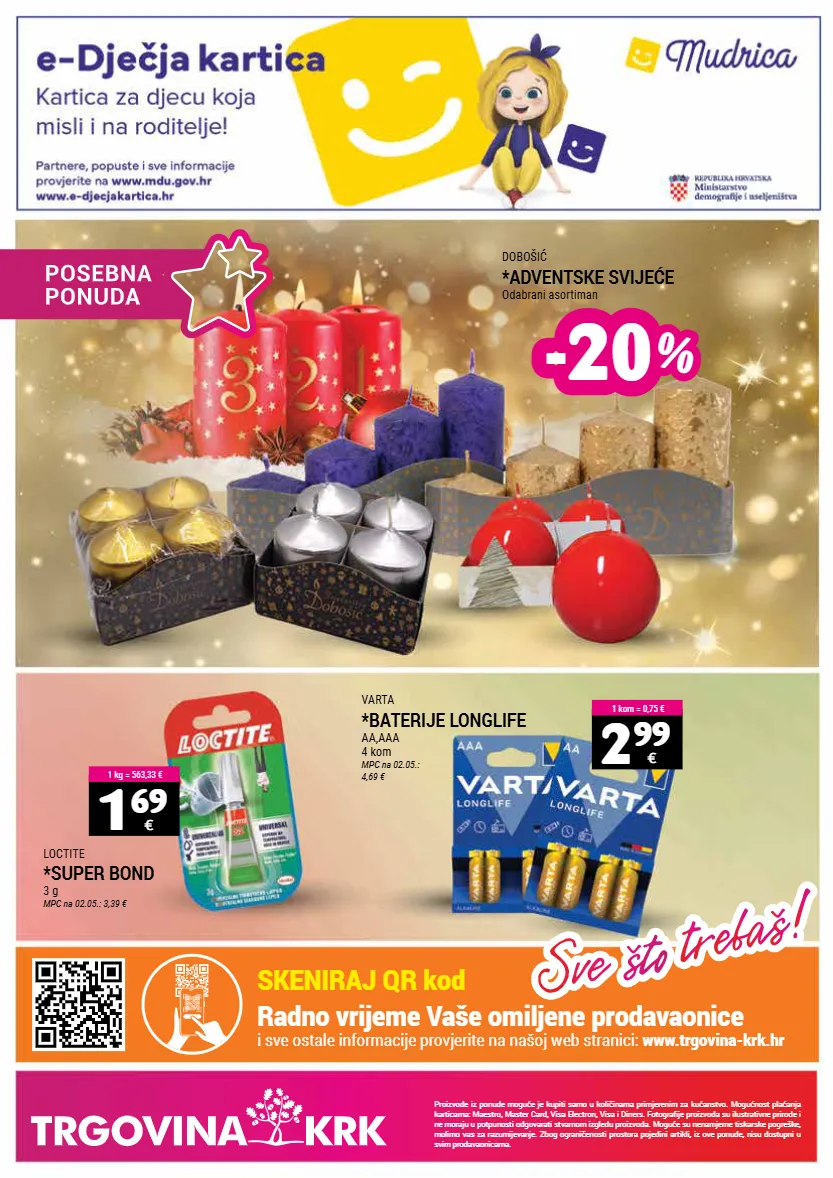 radno vrijeme vaše omiljene prodavaonice i sve ostale informacije provjerite na našoj web stranici: www.trgovina-krk.hr skeniraj qr kod proizvode iz ponude moguće je kupiti samo u količinama primjerenim za kućanstvo. mogućnost plaćanja karticama: maestro, master card, visa electron, visa i diners. fotografije proizvoda su ilustrativne prirode i ne moraju u potpunosti odgovarati stvarnom izgledu proizvoda. moguće su nenamjerne tiskarske pogreške, molimo vas za razumijevanje. zbog ograničenosti prostora pojedini artikli, iz ove ponude, nisu dostupni u svim prodavaonicama. varta *baterije longlife aa,aaa 4 kom mpc na 02.05.: 4,69 € loctite *super bond 3 g mpc na 02.05.: 3,39 € 2 99 € 1 kom = 0,75 € 1 69 € 1 kg = 563,33 € dobošić *adventske svijeće odabrani asortiman -20 -20 % %