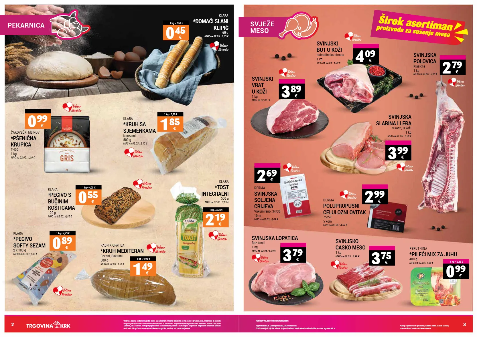*sidrene cijene, snižene i najniže cijene u posljednjih 30 dana istaknute su na polici u prodavaonici. prozivode iz ponude moguće je kupiti samo u količinama primjerenim za kućanstvo. mogućnost plaćanja karticama: maestro, master card, visa electron, visa i diners. fotografije proizvoda su ilustrativne prirode i ne moraju u potpunosti odgovarati stvarnom izgledu proizvoda. moguće su nenamjerne tiskarske pogreške, molimo vas za razumijevanje. ponuda vrijedi u prodavaonicama: trgovina krk d.d. dubašljanska 80, 51511 malinska. popis prodajnih mjesta, adresa, brojeve telefona i ostale aktualnosti potražite na: www.trgovina-krk.hr *zbog ograničenosti prostora pojedini artikli, iz ove ponude, nosu dostupni u svim prodavaonicama. 3 2 klara *domaći slani klipić 60 g mpc na 02.05.: 0,55 € klara *kruh sa sjemenkama narezani 500 g mpc na 02.05.: 2,35 € klara *tost integralni 500 g mpc na 02.05.: 3,19 € klara *pecivo s bučinim košticama 120 g mpc na 02.05.: 0,85 € klara *pecivo softy sezam 2 x 100 g mpc na 02.05.: 1,39 € čakovečki mlinovi *pšenična krupica t-400 1 kg mpc na 02.05.: 1,10 € radnik opatija *kruh mediteran rezani, pakirani 500 g mpc na 02.05.: 1,95 € 0 45 € 1 kg = 7,50 € 1 85 € 1 kg = 3,70 € 2 19 € 1 kg = 4,38 € 0 55 € 1 kg = 4,58 € 0 89 € 1 kg = 4,45 € 1 49 € 1 kg = 2,98 € 0 99 € svinjska lopatica bez kosti 1 kg mpc na 02.05.: 5,99 € svinjska polovica klasična 1 kg mpc na 02.05.: 3,59 € svinjski but u koži dalmatinska obrada 1 kg mpc na 02.05.: 5,99 € svinjska slabina i leđa s kosti, u koži 1 kg mpc na 02.05.: 5,79 € svinjski vrat u koži 1 kg mpc na 02.05.: € svinjsko casko meso 1 kg mpc na 02.05.: 4,99 € 3 79 € 2 79 € 4 09 € 3 99 € 3 89 € 3 75 € perutnina *pileći mix za juhu 400 g mpc na 02.05.: 1,29 € 0 99 € 1 kg = 2,48 € derma svinjska soljena crijeva vakumirano, 34/36 10 m mpc na 02.05.: 4,09 € derma polupropusni celulozni ovitak 75/59 5 kom mpc na 02.05.: 4,69 € 2 69 € 2 99 € širok asortiman proizvoda za sušenje mesa