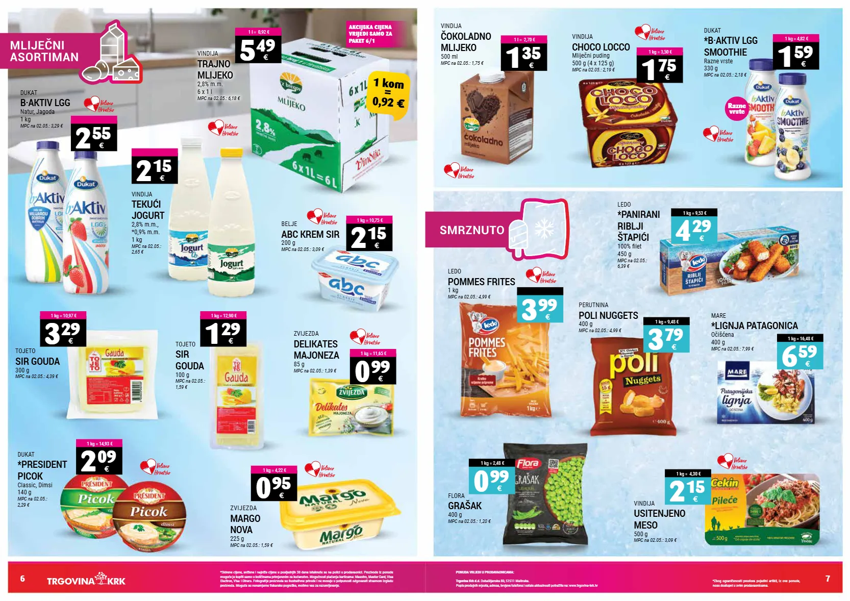 *sidrene cijene, snižene i najniže cijene u posljednjih 30 dana istaknute su na polici u prodavaonici. prozivode iz ponude moguće je kupiti samo u količinama primjerenim za kućanstvo. mogućnost plaćanja karticama: maestro, master card, visa electron, visa i diners. fotografije proizvoda su ilustrativne prirode i ne moraju u potpunosti odgovarati stvarnom izgledu proizvoda. moguće su nenamjerne tiskarske pogreške, molimo vas za razumijevanje. ponuda vrijedi u prodavaonicama: trgovina krk d.d. dubašljanska 80, 51511 malinska. popis prodajnih mjesta, adresa, brojeve telefona i ostale aktualnosti potražite na: www.trgovina-krk.hr *zbog ograničenosti prostora pojedini artikli, iz ove ponude, nosu dostupni u svim prodavaonicama. 7 6 zvijezda delikates majoneza 85 g mpc na 02.05.: 1,39 € tojeto sir gouda 300 g mpc na 02.05.: 4,39 € tojeto sir gouda 100 g mpc na 02.05.: 1,59 € 0 99 € 1 kg = 11,65 € 3 29 € 1 kg = 10,97 € 1 29 € 1 kg = 12,90 € belje abc krem sir 200 g mpc na 02.05.: 3,09 € 2 15 € 1 kg = 10,75 € dukat *president picok classic, dimsi 140 g mpc na 02.05.: 2,29 € vindija trajno mlijeko 2,8% m.m. 6 x 1 l mpc na 02.05.: 6,18 € vindija čokoladno mlijeko 500 ml mpc na 02.05.: 1,75 € vindija tekući jogurt 2,8% m.m., *0,9% m.m. 1 kg mpc na 02.05.: 2,65 € vindija choco locco mliječni puding 500 g (4 x 125 g) mpc na 02.05.: 2,19 € dukat b·aktiv lgg natur, jagoda 1 kg mpc na 02.05.: 3,29 € dukat *b·aktiv lgg smoothie razne vrste 330 g mpc na 02.05.: 2,18 € 2 09 € 1 kg = 14,93 € 5 49 € 1 l = 0,92 € 1 35 € 1 l = 2,70 € 2 15 € 1 75 € 1 kg = 3,50 € 1 59 € 1 kg = 4,82 € 2 55 € zvijezda margo nova 225 g mpc na 02.05.: 1,59 € 0 95 € 1 kg = 4,22 € perutnina poli nuggets 400 g mpc na 02.05.: 4,99 € ledo pommes frites 1 kg mpc na 02.05.: 4,99 € ledo *panirani riblji štapići 100% filet 450 g mpc na 02.05.: 6,39 € flora grašak 400 g mpc na 02.05.: 1,20 € mare *lignja patagonica očišćena 400 g mpc na 02.05.: 7,99 € vindija usitenjeno meso 500 g mpc na 02.05.: 3,09 € 3 79 € 1 kg = 9,48 € 4 29 € 1 kg = 9,53 € 0 99 € 1 kg = 2,48 € 6 59 € 1 kg = 16,48 € 2 15 € 1 kg = 4,30 € 3 99 € 1 kom = 0,92 € akcijska cijena vrijedi samo za paket 6/1 razne vrste