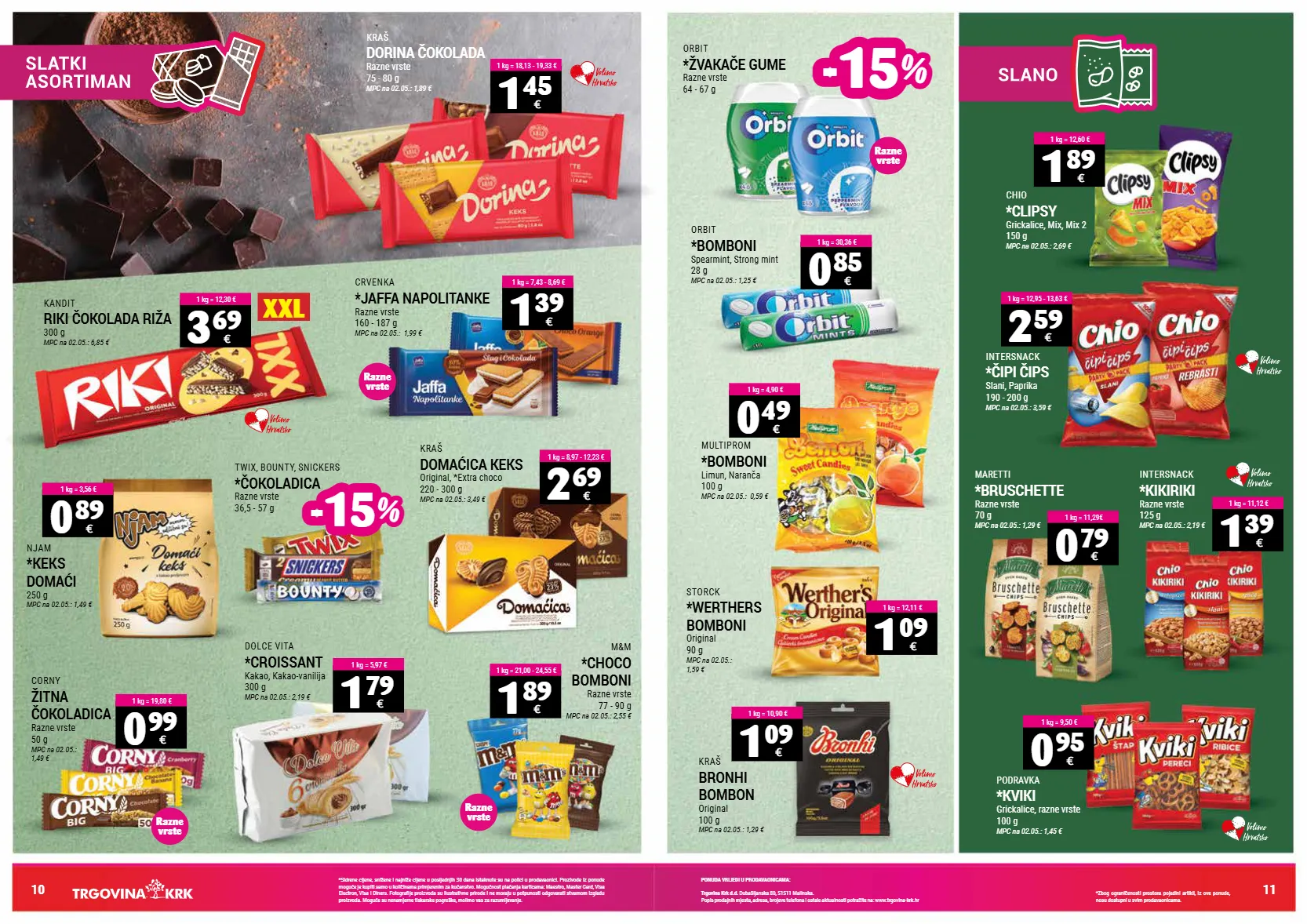 *sidrene cijene, snižene i najniže cijene u posljednjih 30 dana istaknute su na polici u prodavaonici. prozivode iz ponude moguće je kupiti samo u količinama primjerenim za kućanstvo. mogućnost plaćanja karticama: maestro, master card, visa electron, visa i diners. fotografije proizvoda su ilustrativne prirode i ne moraju u potpunosti odgovarati stvarnom izgledu proizvoda. moguće su nenamjerne tiskarske pogreške, molimo vas za razumijevanje. ponuda vrijedi u prodavaonicama: trgovina krk d.d. dubašljanska 80, 51511 malinska. popis prodajnih mjesta, adresa, brojeve telefona i ostale aktualnosti potražite na: www.trgovina-krk.hr *zbog ograničenosti prostora pojedini artikli, iz ove ponude, nosu dostupni u svim prodavaonicama. 11 10 crvenka *jaffa napolitanke razne vrste 160 - 187 g mpc na 02.05.: 1,99 € kraš bronhi bombon original 100 g mpc na 02.05.: 1,29 € dolce vita *croissant kakao, kakao-vanilija 300 g mpc na 02.05.: 2,19 € multiprom *bomboni limun, naranča 100 g mpc na 02.05.: 0,59 € corny žitna čokoladica razne vrste 50 g mpc na 02.05.: 1,49 € kraš dorina čokolada razne vrste 75 - 80 g mpc na 02.05.: 1,89 € njam *keks domaći 250 g mpc na 02.05.: 1,49 € storck *werthers bomboni original 90 g mpc na 02.05.: 1,59 € 1 39 € 1 kg = 7,43 - 8,69 € 1 09 € 1 kg = 10,90 € 1 79 € 1 kg = 5,97 € 0 49 € 1 kg = 4,90 € 0 99 € 1 kg = 19,80 € 1 45 € 1 kg = 18,13 - 19,33 € 0 89 € 1 kg = 3,56 € 1 09 € 1 kg = 12,11 € orbit *žvakače gume razne vrste 64 - 67 g twix, bounty, snickers *čokoladica razne vrste 36,5 - 57 g orbit *bomboni spearmint, strong mint 28 g mpc na 02.05.: 1,25 € kandit riki čokolada riža 300 g mpc na 02.05.: 6,85 € m&m *choco bomboni razne vrste 77 - 90 g mpc na 02.05.: 2,55 € 0 85 € 1 kg = 30,36 € 3 69 € 1 kg = 12,30 € 1 89 € 1 kg = 21,00 - 24,55 € -15 -15 % % -15 -15 % % podravka *kviki grickalice, razne vrste 100 g mpc na 02.05.: 1,45 € intersnack *kikiriki razne vrste 125 g mpc na 02.05.: 2,19 € chio *clipsy grickalice, mix, mix 2 150 g mpc na 02.05.: 2,69 € maretti *bruschette razne vrste 70 g mpc na 02.05.: 1,29 € intersnack *čipi čips slani, paprika 190 - 200 g mpc na 02.05.: 3,59 € 0 95 € 1 kg = 9,50 € 1 39 € 1 kg = 11,12 € 1 89 € 1 kg = 12,60 € 0 79 € 1 kg = 11,29€ 2 59 € 1 kg = 12,95 - 13,63 € xxl razne vrste razne vrste razne vrste razne vrste kraš domaćica keks original, *extra choco 220 - 300 g mpc na 02.05.: 3,49 € 2 69 € 1 kg = 8,97 - 12,23 €